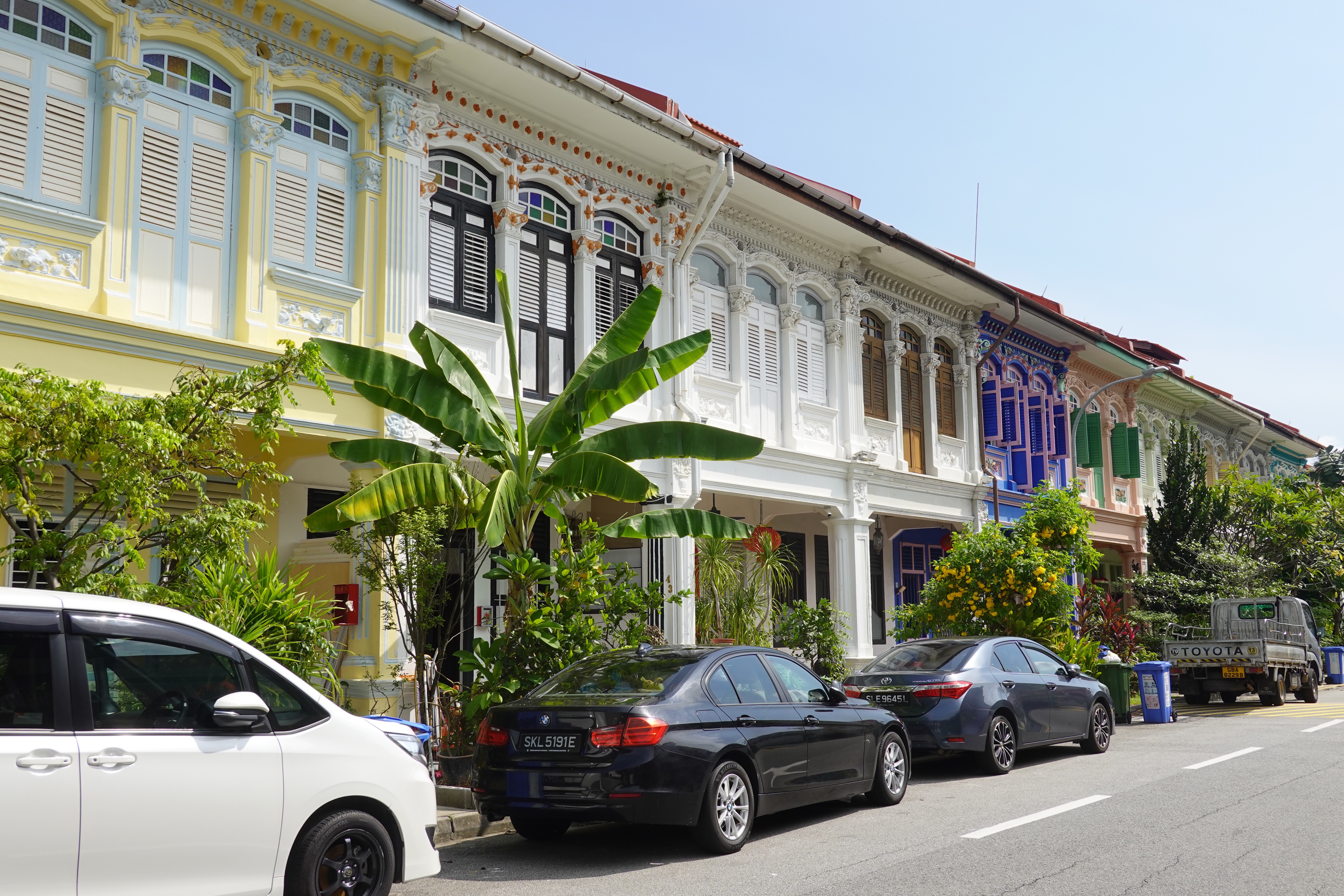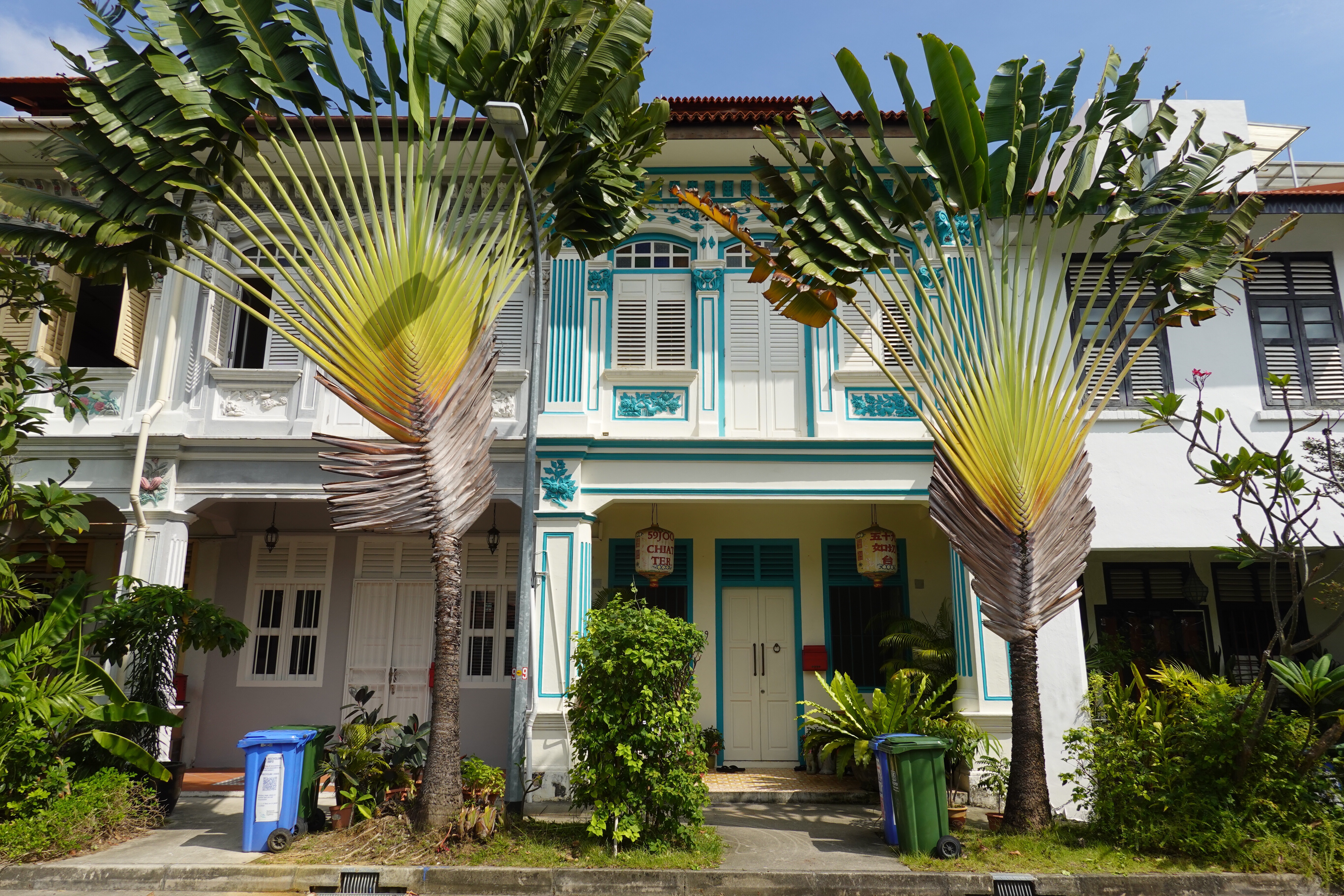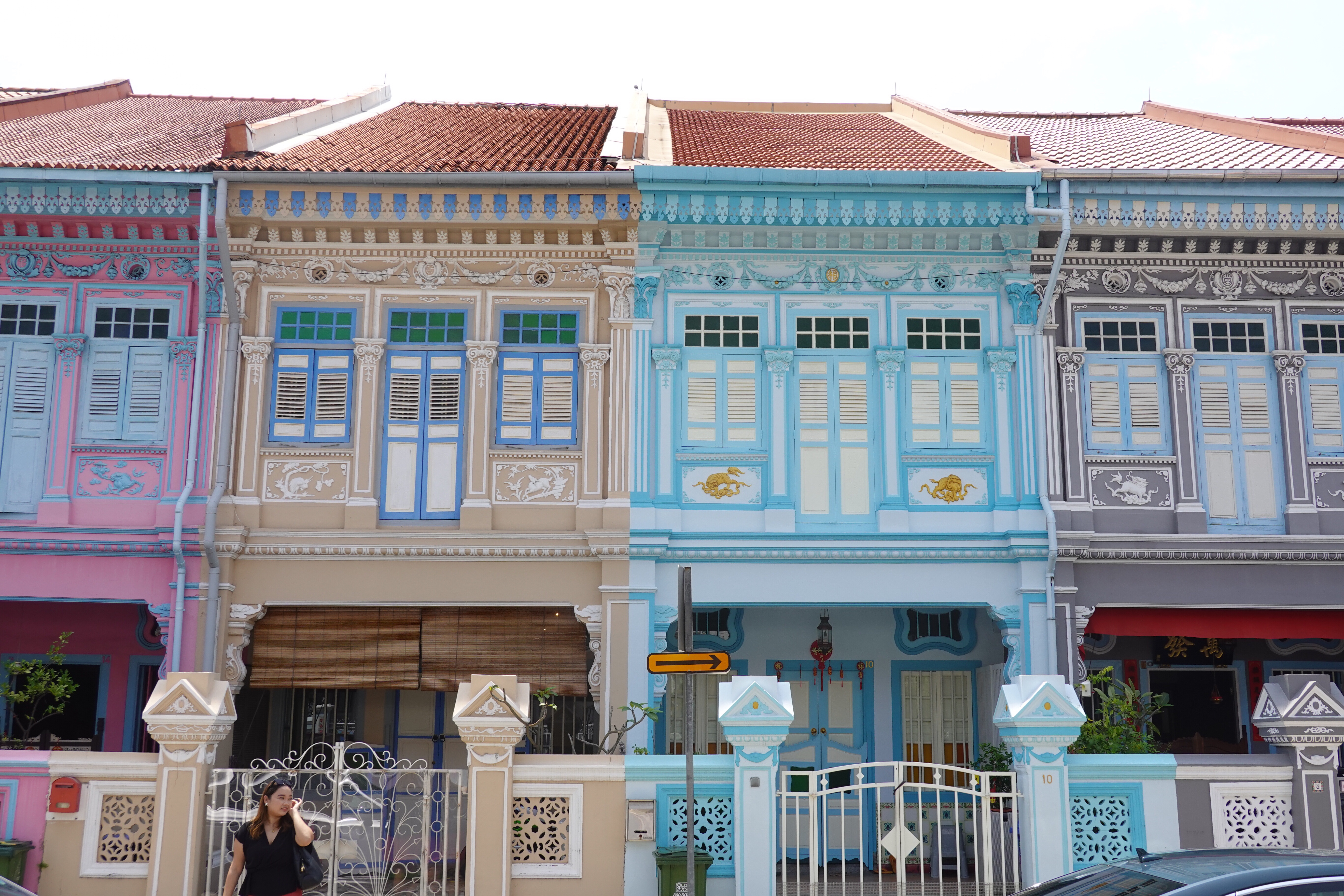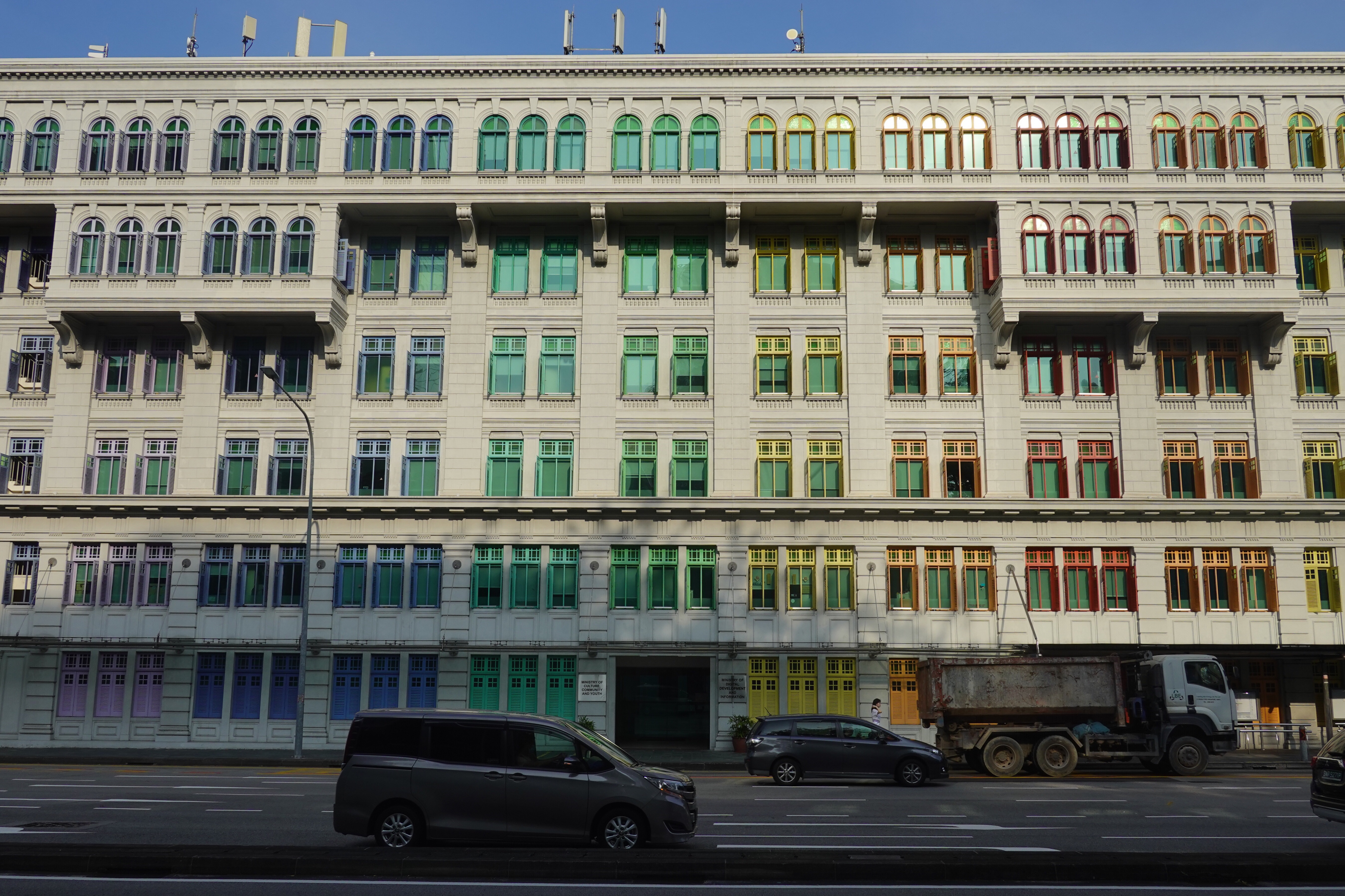 So Singapore, that very modern Western/Asian fusion city, turns out to have a lot of colour. Some is in found objects – the rich green of tropical foliage; the lemon, lime and orange infusion of palm frond stalks; the plastic netting around bags of potatoes and onions; the plastic chairs and tableware of an outdoor seafood restaurant. But a lot of the colour is deliberately applied to jazz up the decor. Whole streets of shophouses are a frenzied mashup from the Pantone charts, with the upper floors and shutters painted to catch the eye and please the senses. Even institutional buildings are given the shutter treatment. It works – and provides a bit of an antidote to the order otherwise around.