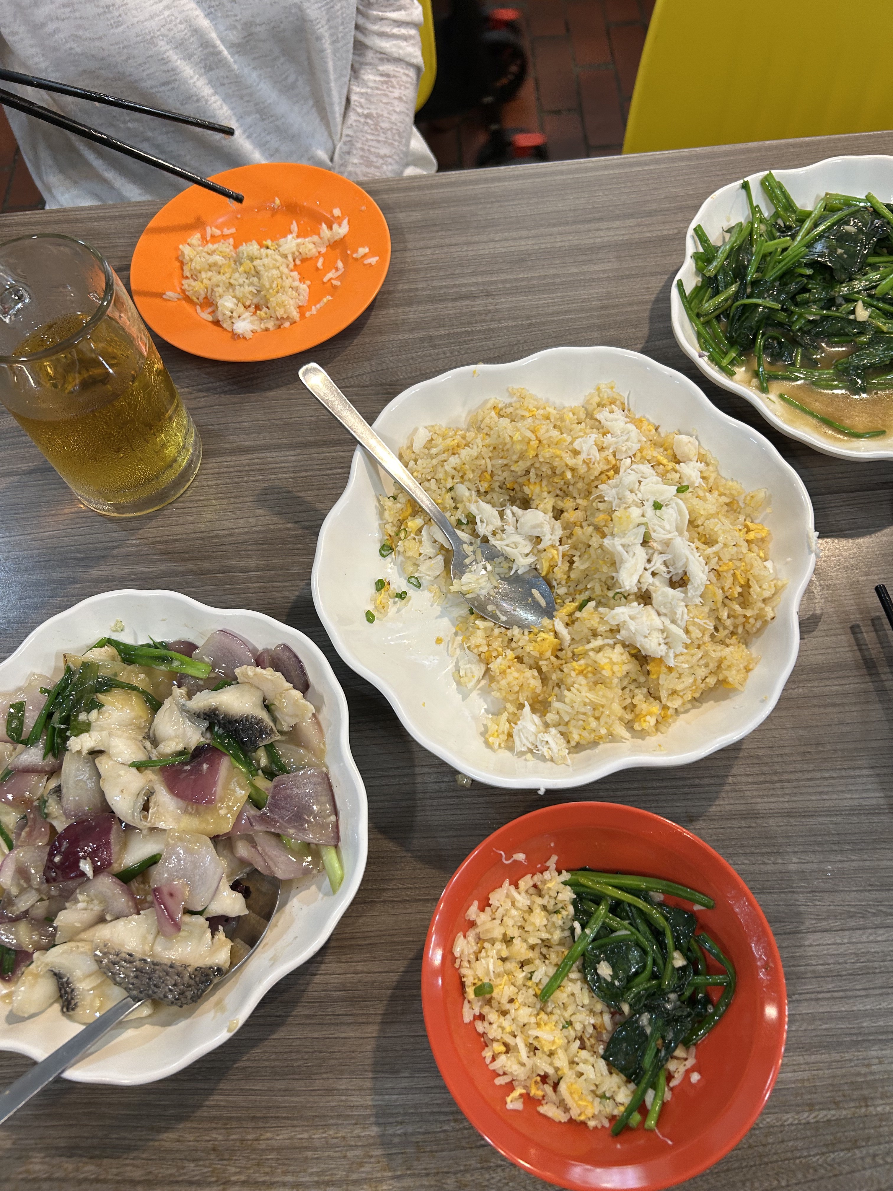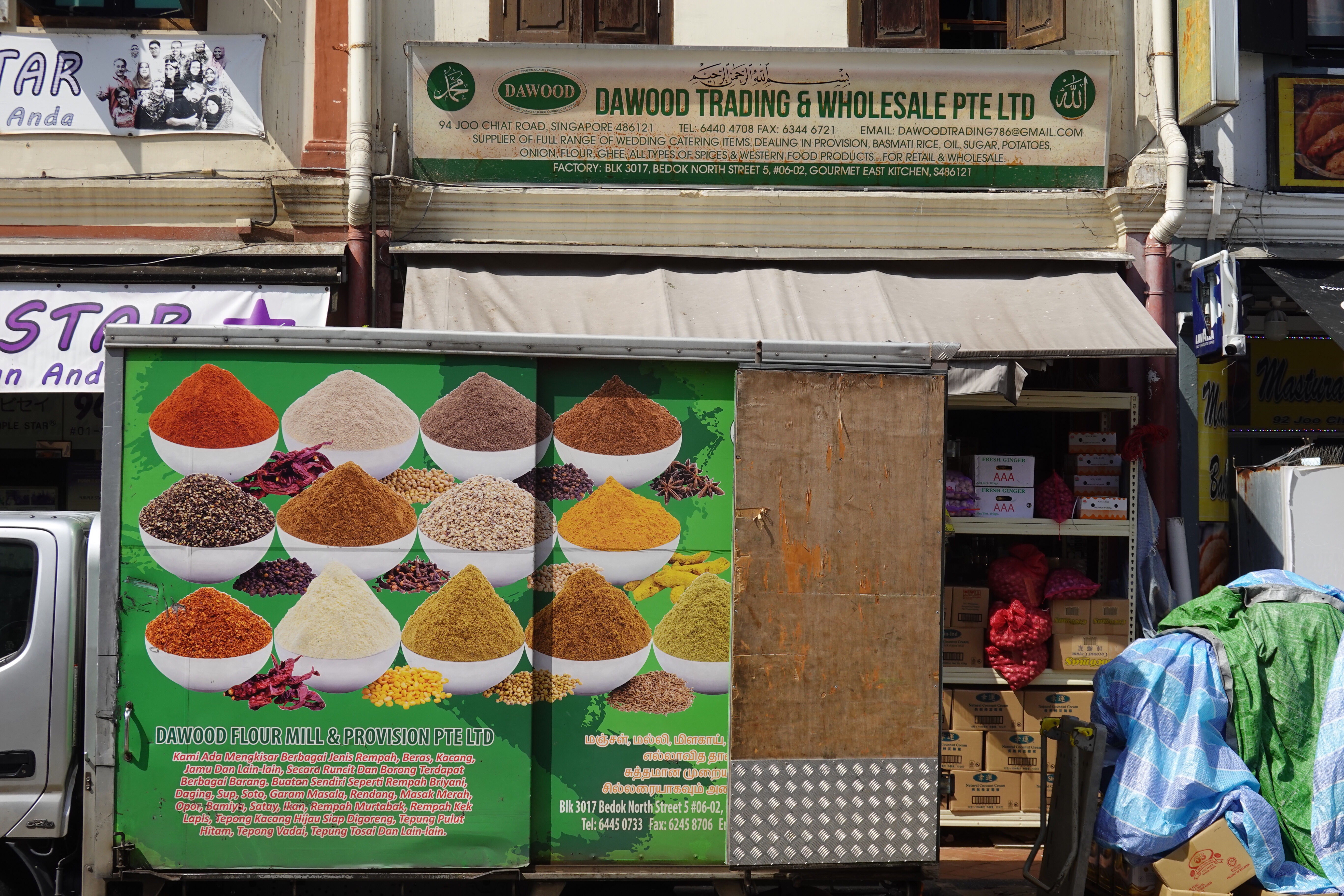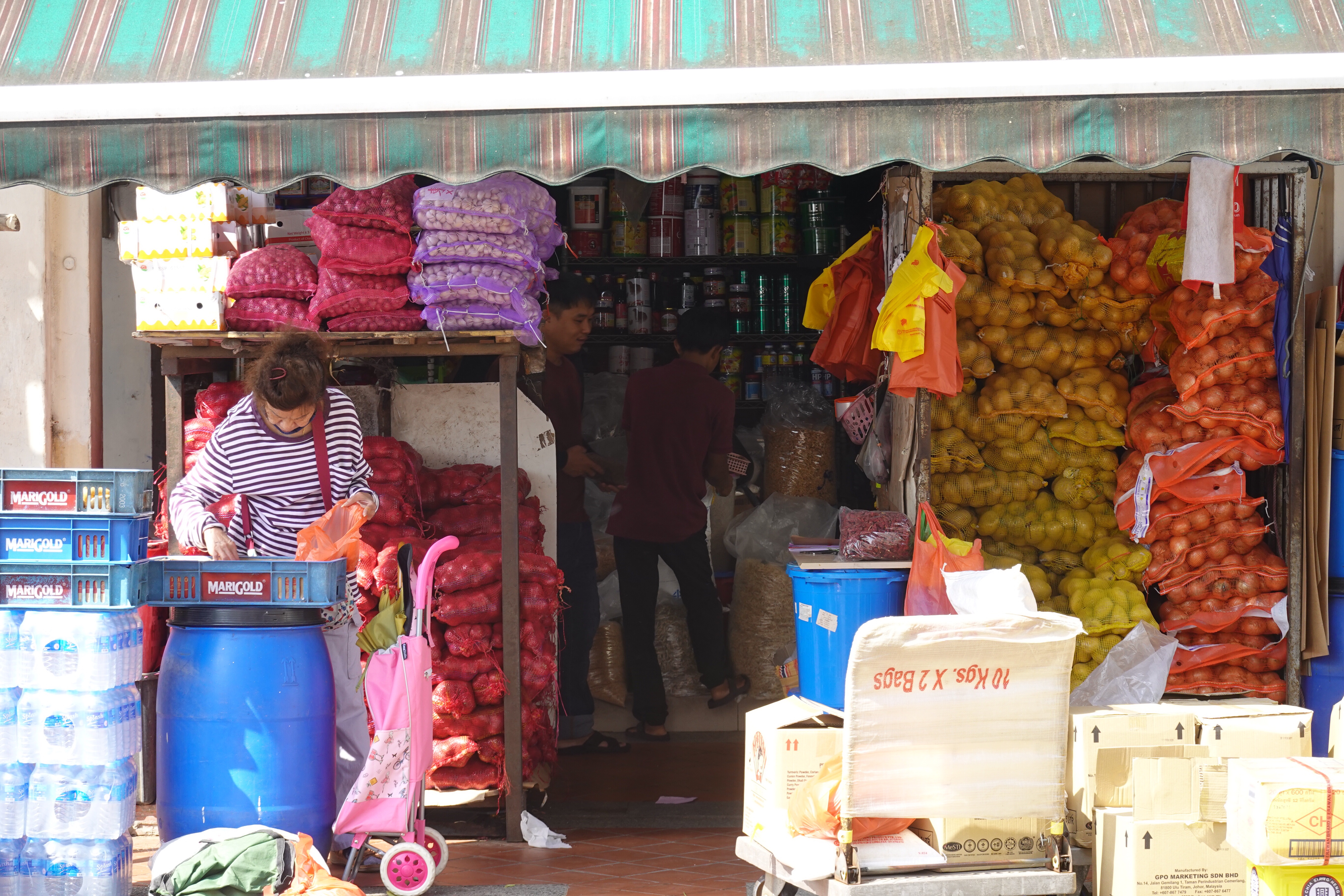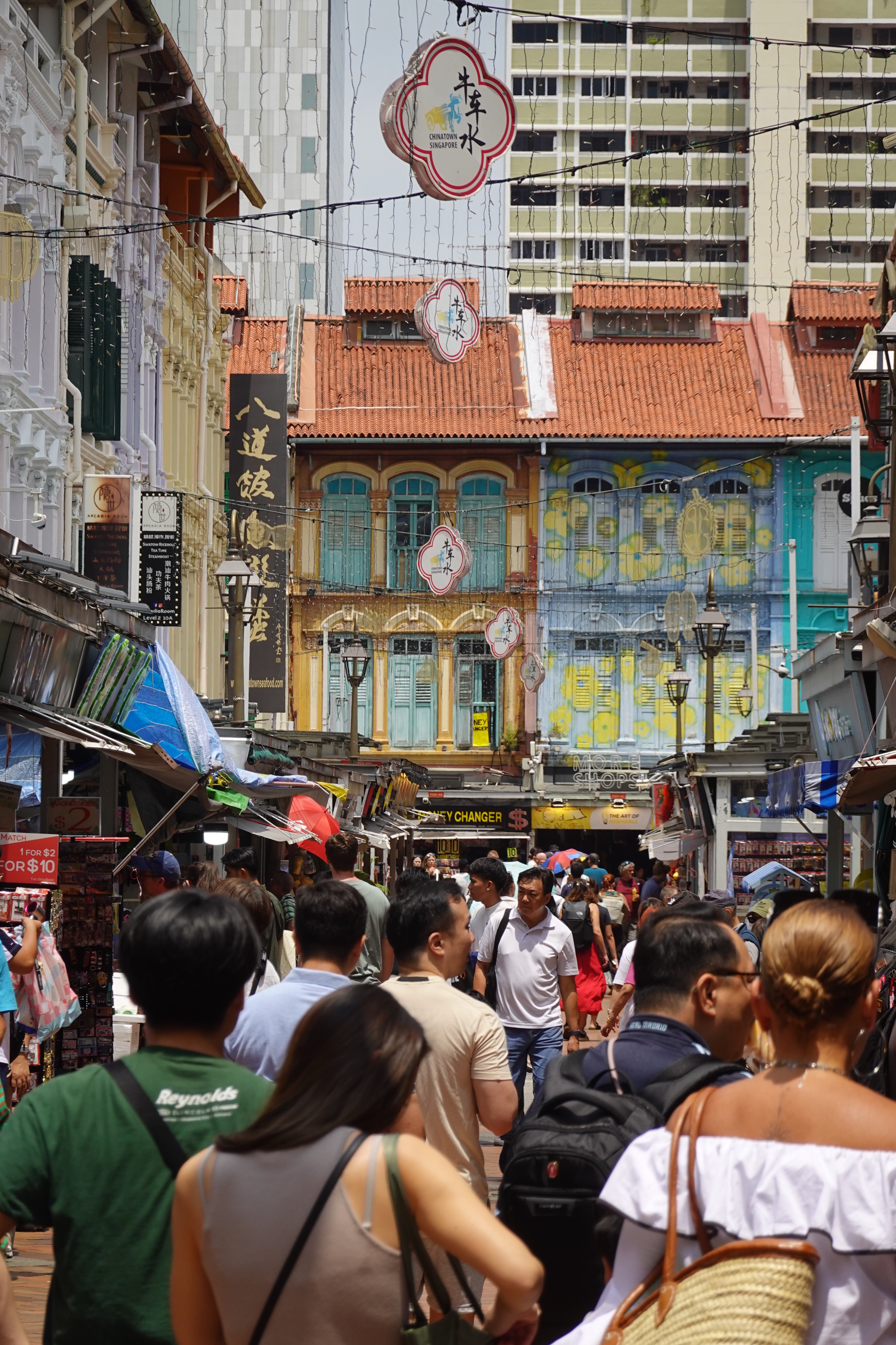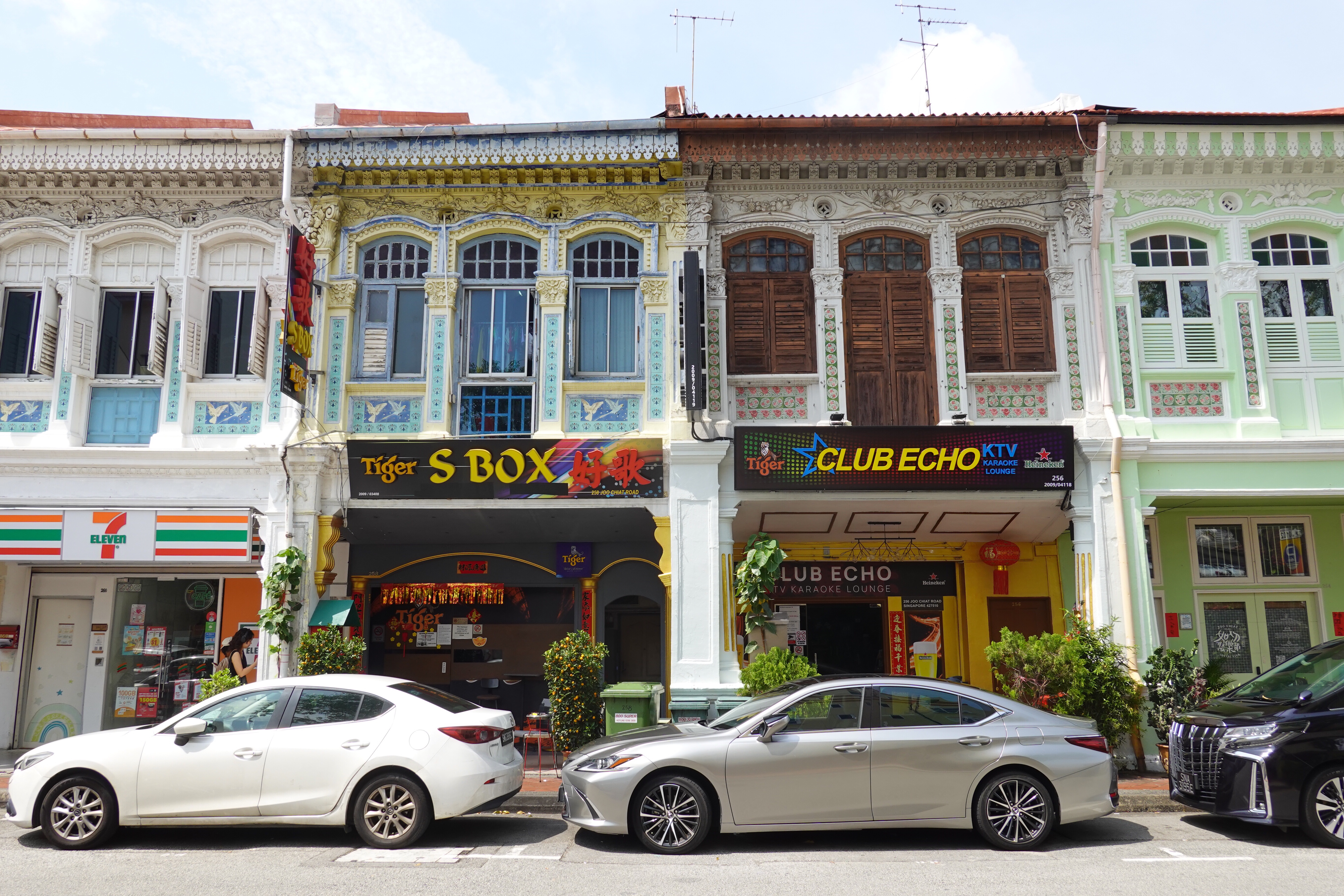 So Singapore, that very modern Western/Asian fusion city, turns out to have a lot of colour. Some is in found objects – the rich green of tropical foliage; the lemon, lime and orange infusion of palm frond stalks; the plastic netting around bags of potatoes and onions; the plastic chairs and tableware of an outdoor seafood restaurant. But a lot of the colour is deliberately applied to jazz up the decor. Whole streets of shophouses are a frenzied mashup from the Pantone charts, with the upper floors and shutters painted to catch the eye and please the senses. Even institutional buildings are given the shutter treatment. It works – and provides a bit of an antidote to the order otherwise around.