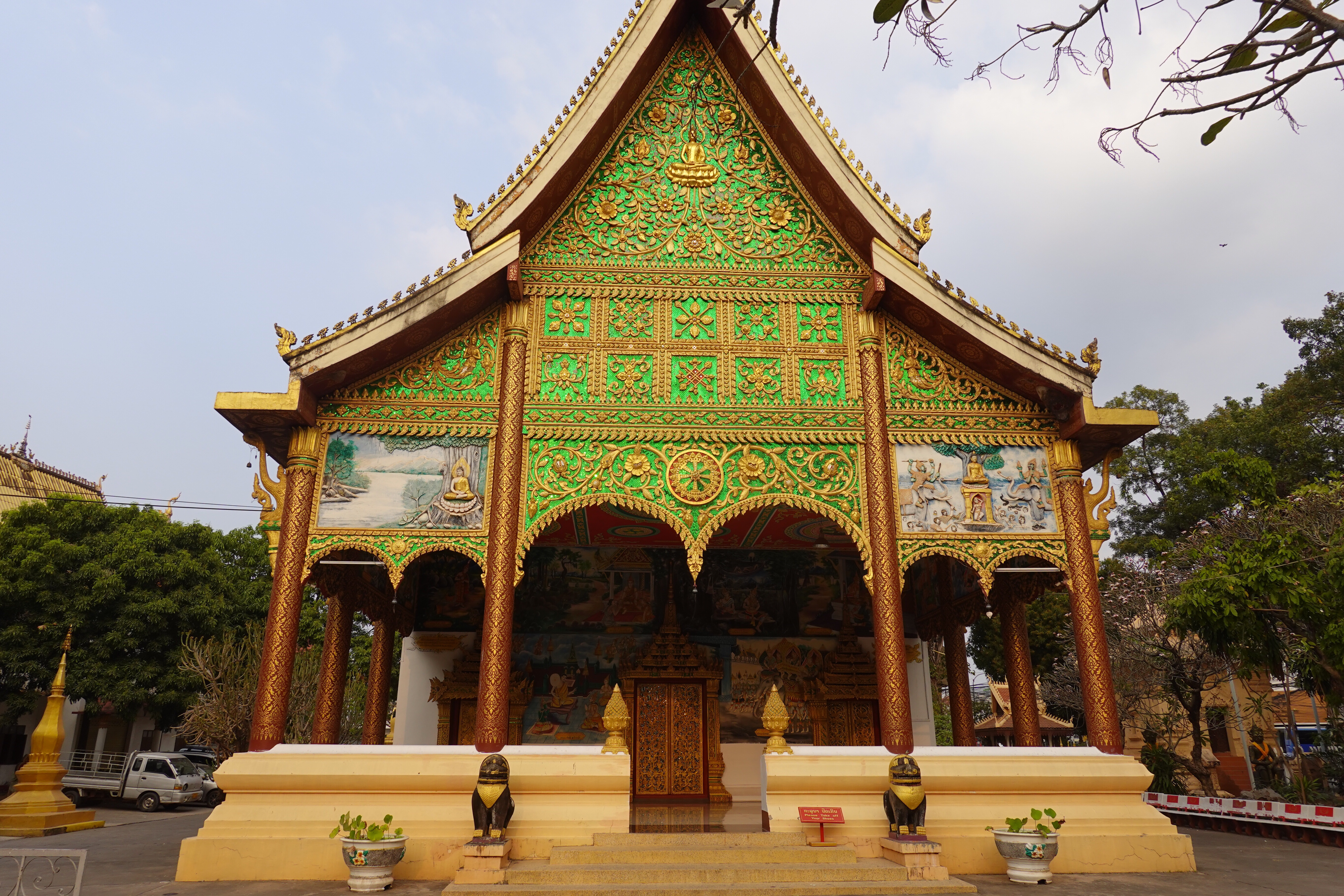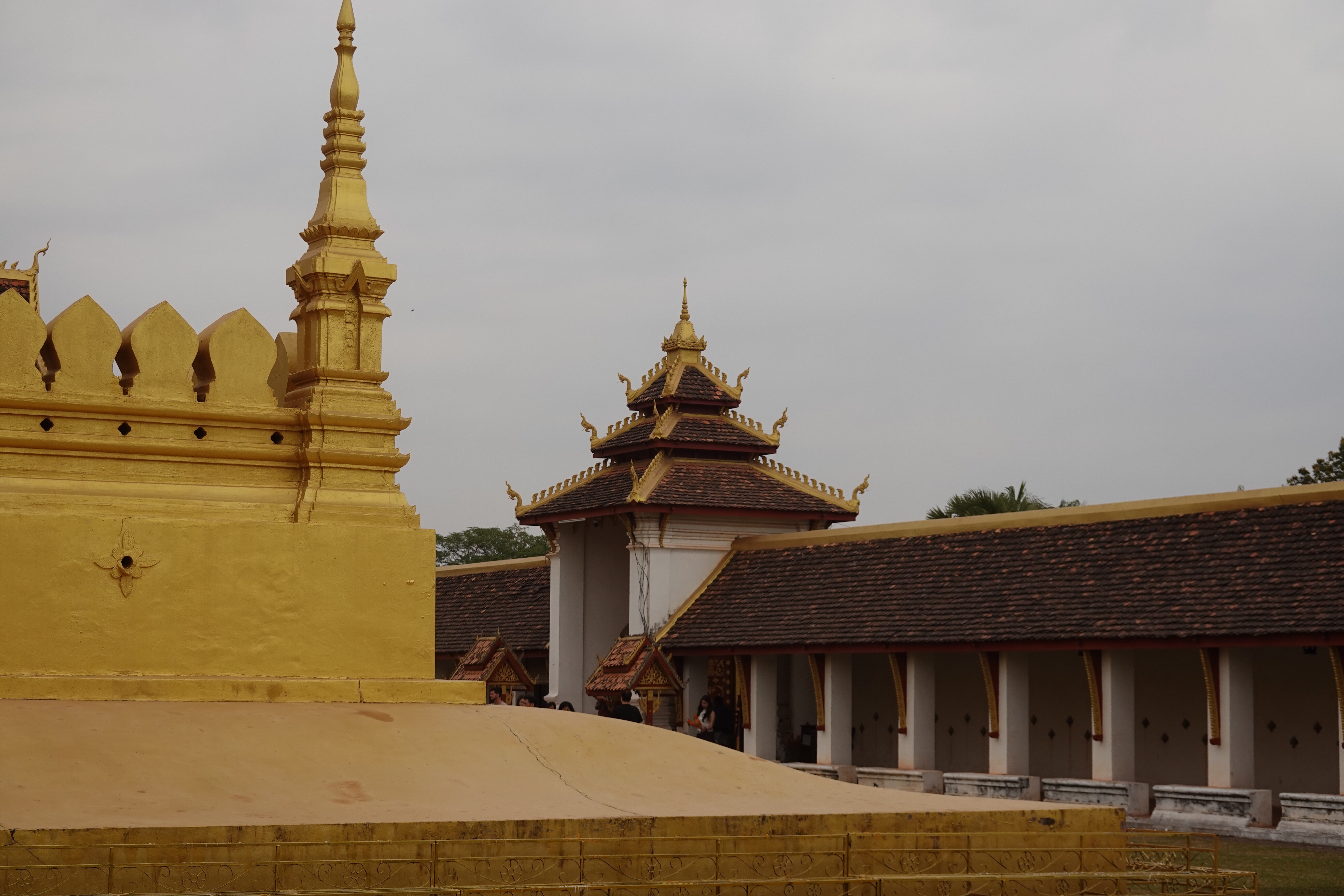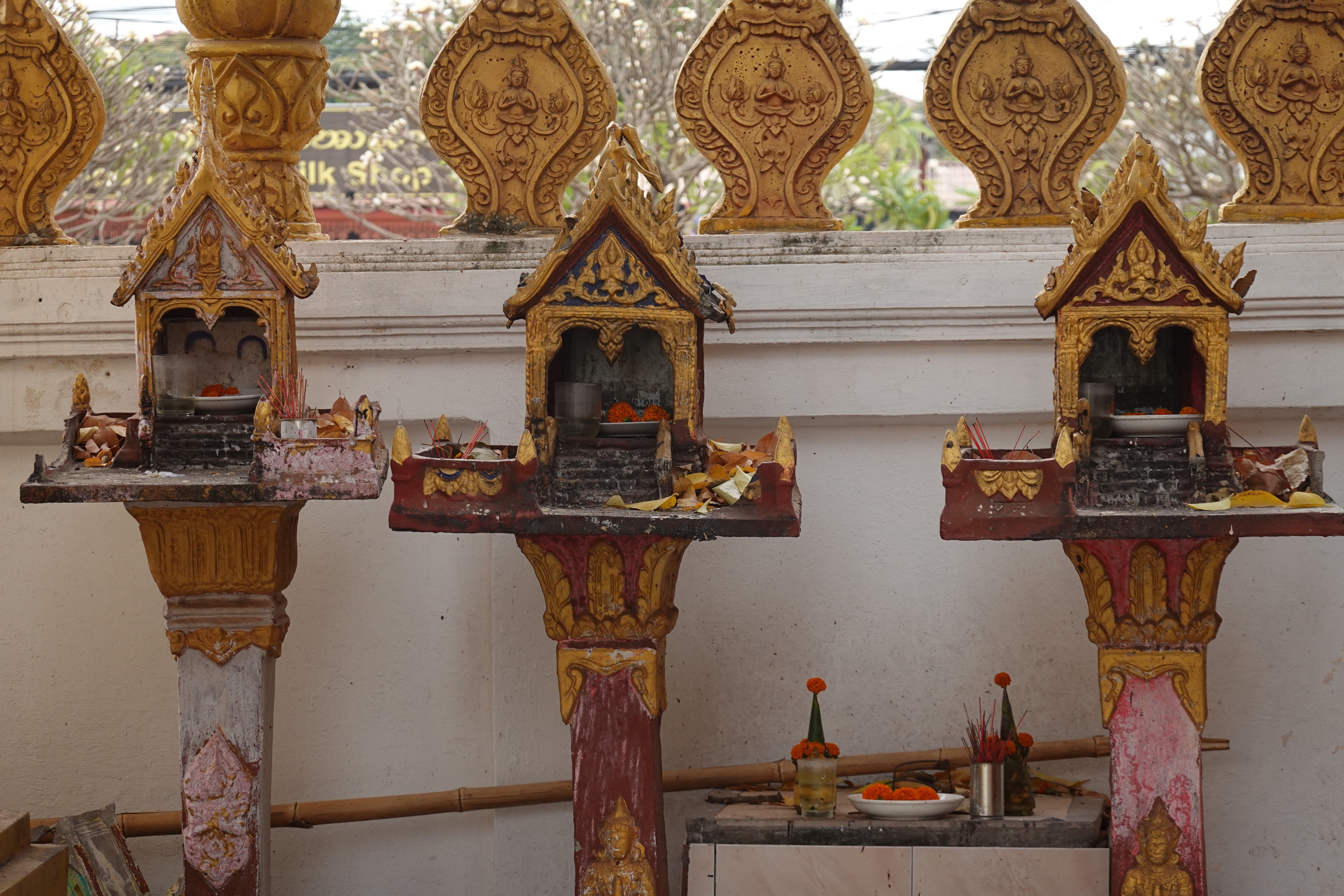 And there are a lot of temples and stupas, both small and overgrown and needing a bit of paint and larger and iconic and glistening in gold. We went to Pha That Luang, the most famous, with its gold stupa apparently enclosing the much older and smaller one that preceded it. Richly decorated Buddhist temples surround it and golden funereal stupas abound, but what is rather lovely is that on the same grounds are animistic spirit houses, and people selling live sparrows in little bamboo cages that the purchasers release to fly away taking bad luck or bad feelings with them, and the decor features Hindu motifs like the monkey king of mythical lore. Vientiane may not get no respect, but was a very easy and welcoming place for us to spend a short time as our introduction to Lao.