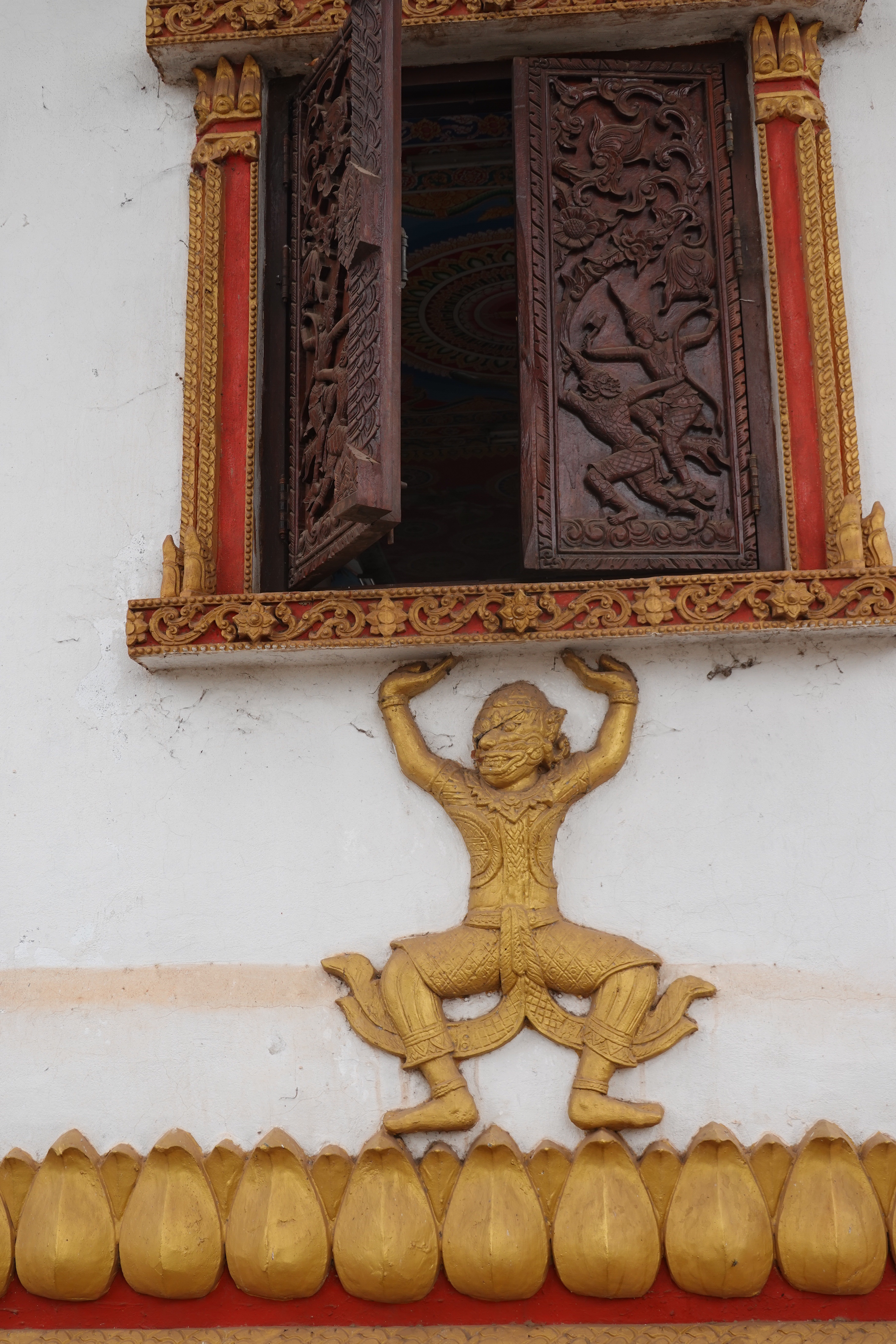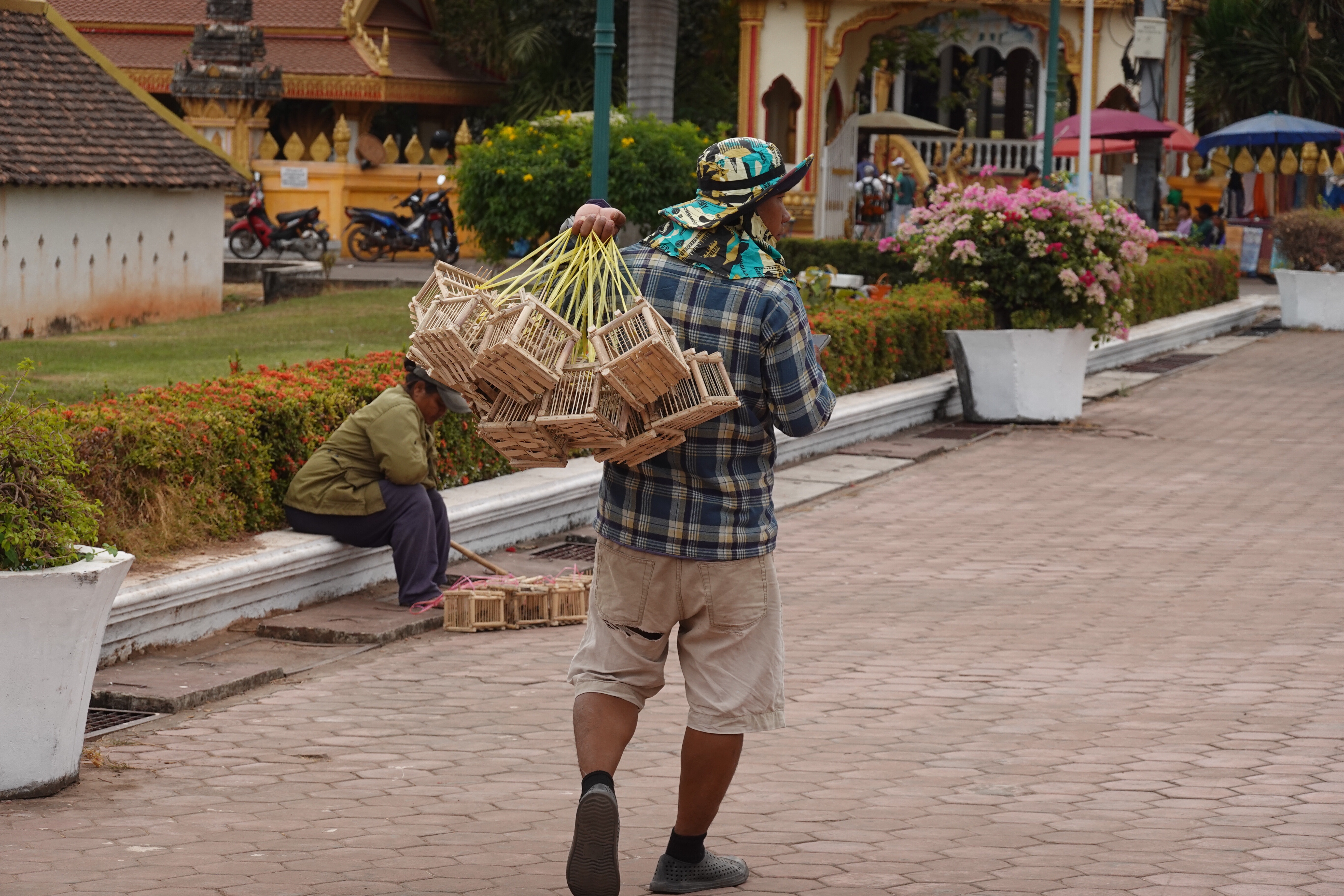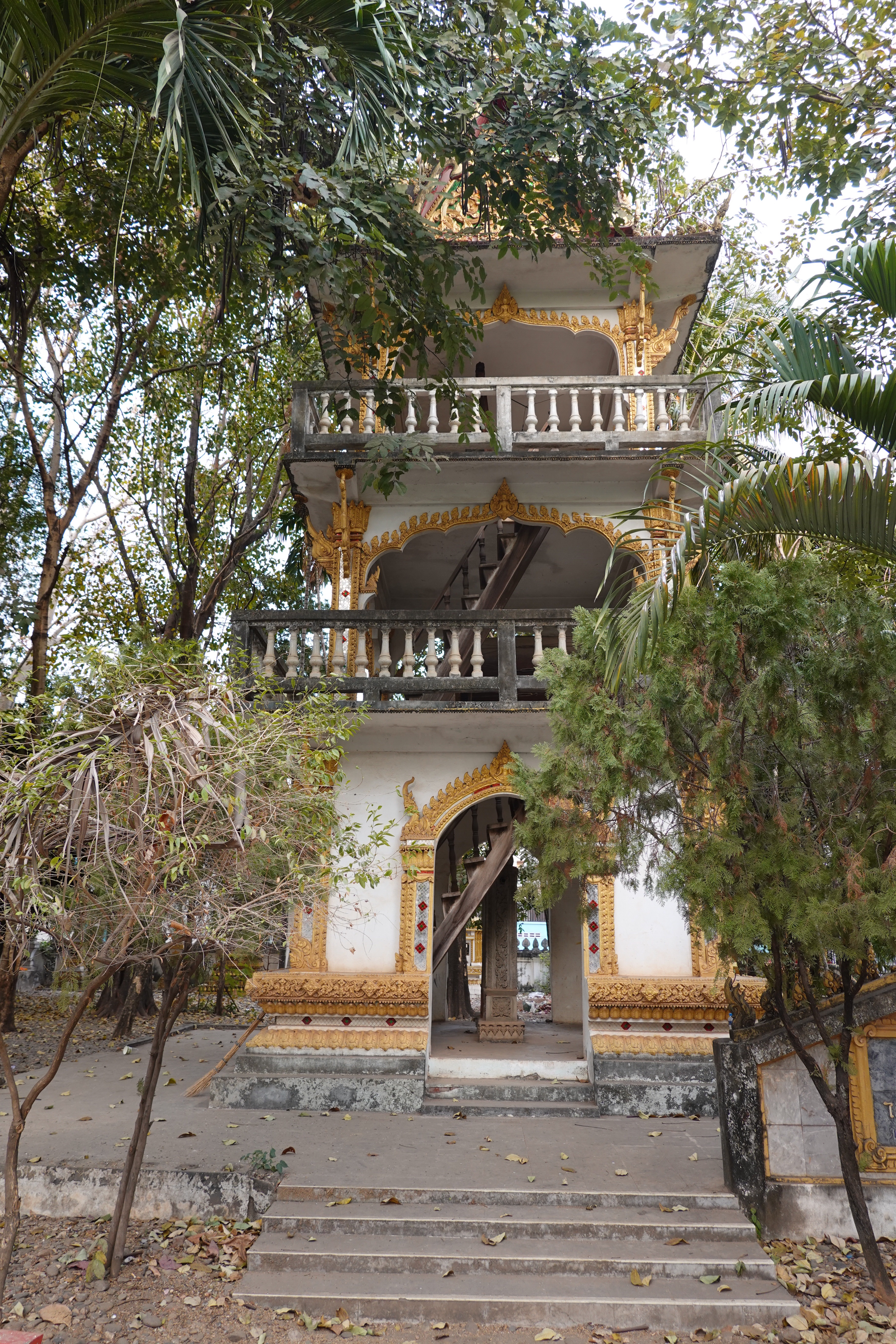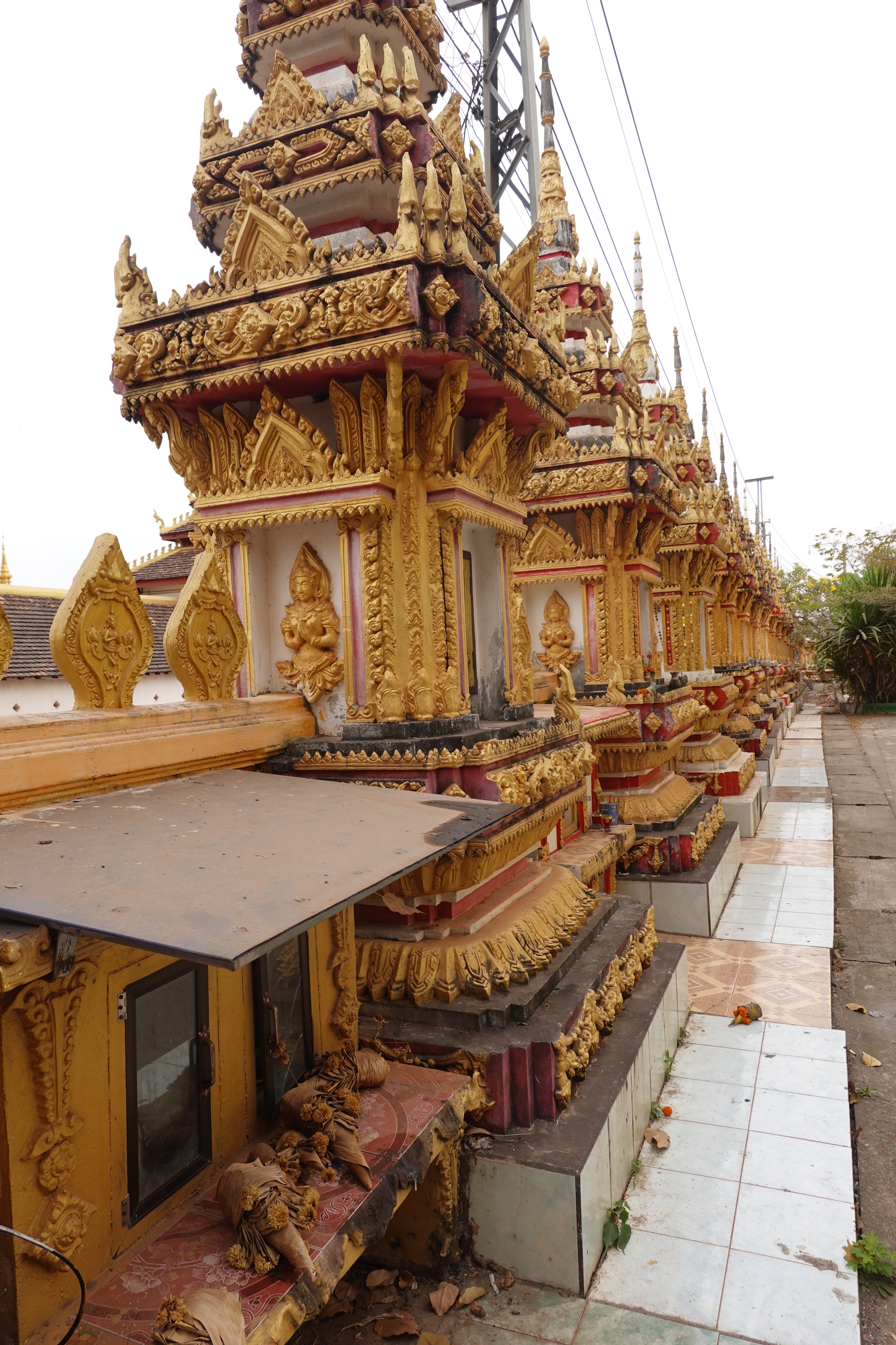 And there are a lot of temples and stupas, both small and overgrown and needing a bit of paint and larger and iconic and glistening in gold. We went to Pha That Luang, the most famous, with its gold stupa apparently enclosing the much older and smaller one that preceded it. Richly decorated Buddhist temples surround it and golden funereal stupas abound, but what is rather lovely is that on the same grounds are animistic spirit houses, and people selling live sparrows in little bamboo cages that the purchasers release to fly away taking bad luck or bad feelings with them, and the decor features Hindu motifs like the monkey king of mythical lore. Vientiane may not get no respect, but was a very easy and welcoming place for us to spend a short time as our introduction to Lao.