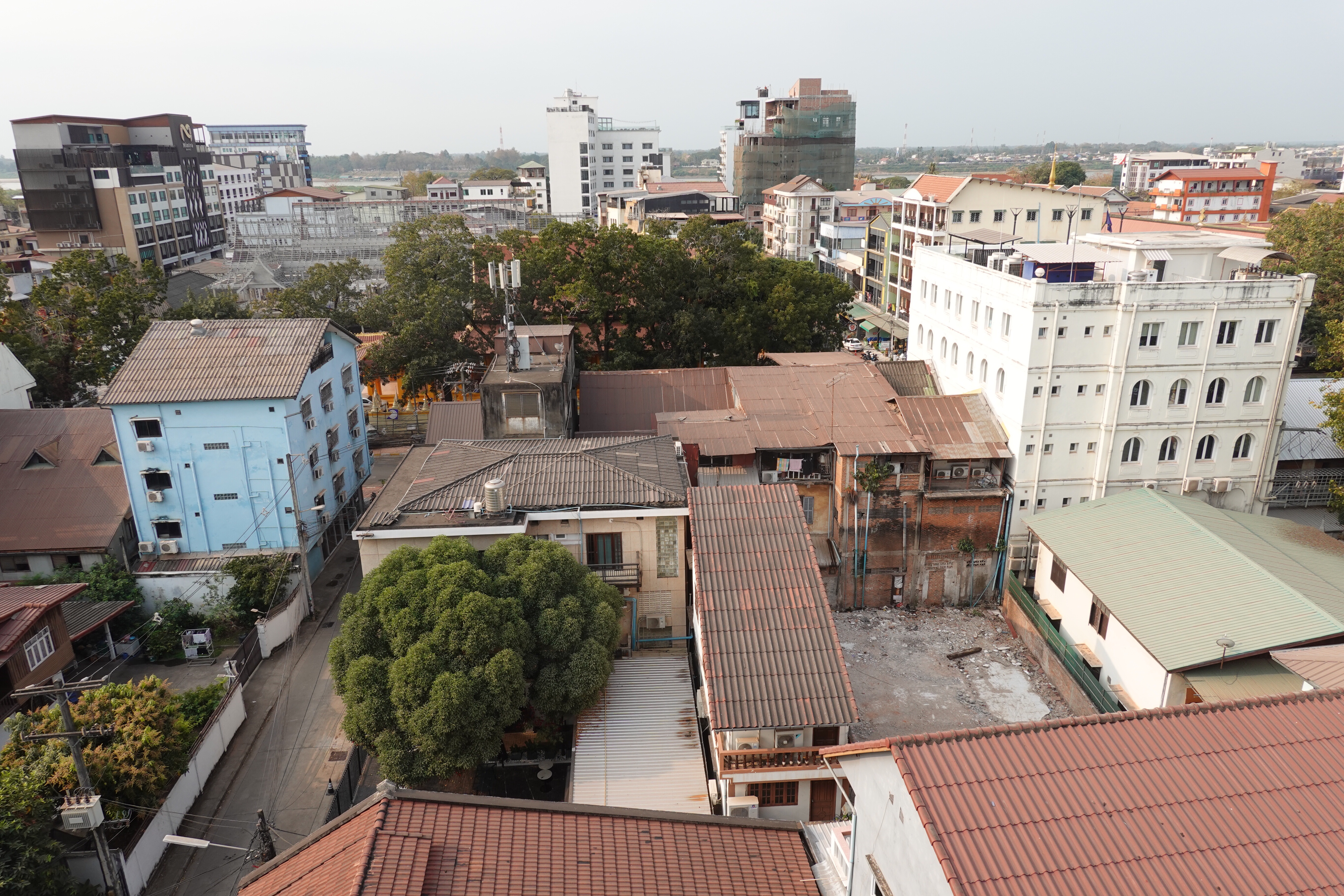 The books also say that Vientiane is one of the quietest capitals in the world, meaning low key and not much going on, and they are probably right about that, even if you include Ottawa among the comparators. Our hotel was promoted as being in the heart of the action – what we obviously see as our sweet spot – but the reference to action was pretty much aspirational (neighbourhood view in the photo from the rooftop below) as the hotel was surrounded by the usual collection of tiny produce shops, food stalls selling late night and early morning street food, and micro retail of various kinds specializing in everything from construction supplies to what looked like rear view mirrors. The waterfront, a happening place in most towns and cities, was an unpopulated view from a busy road over a distant Mekong river, receded from the the quayside for the dry season.
