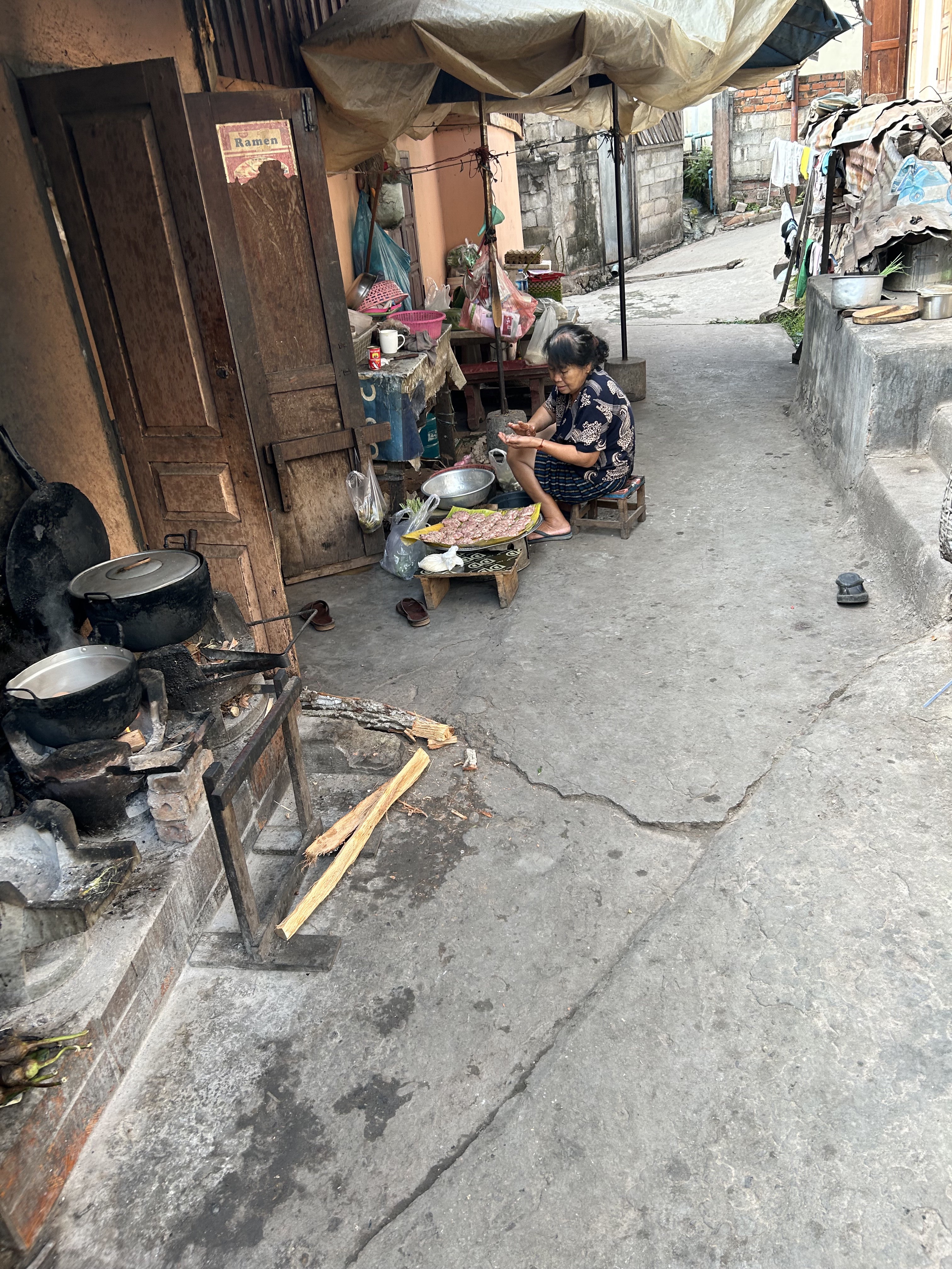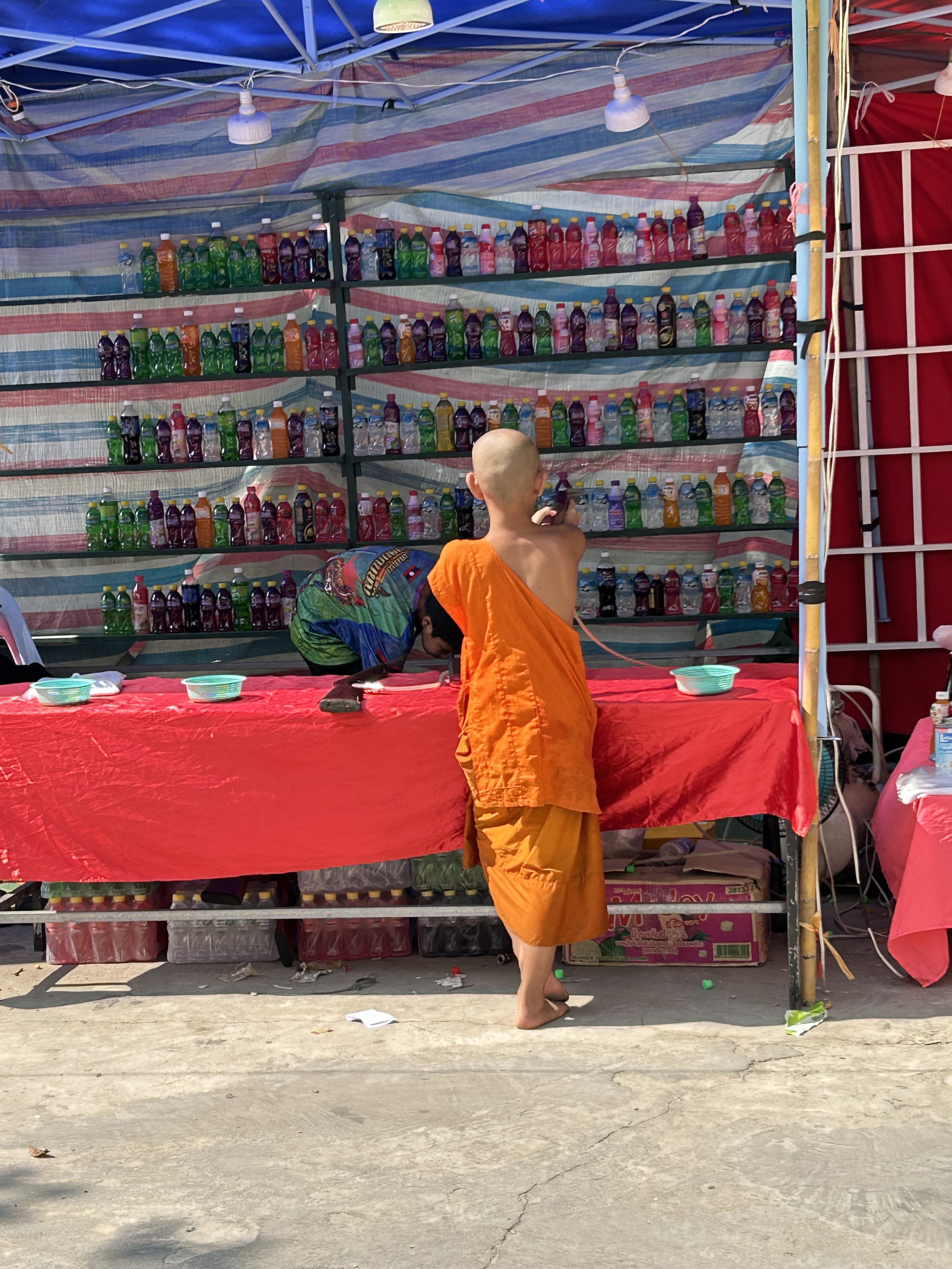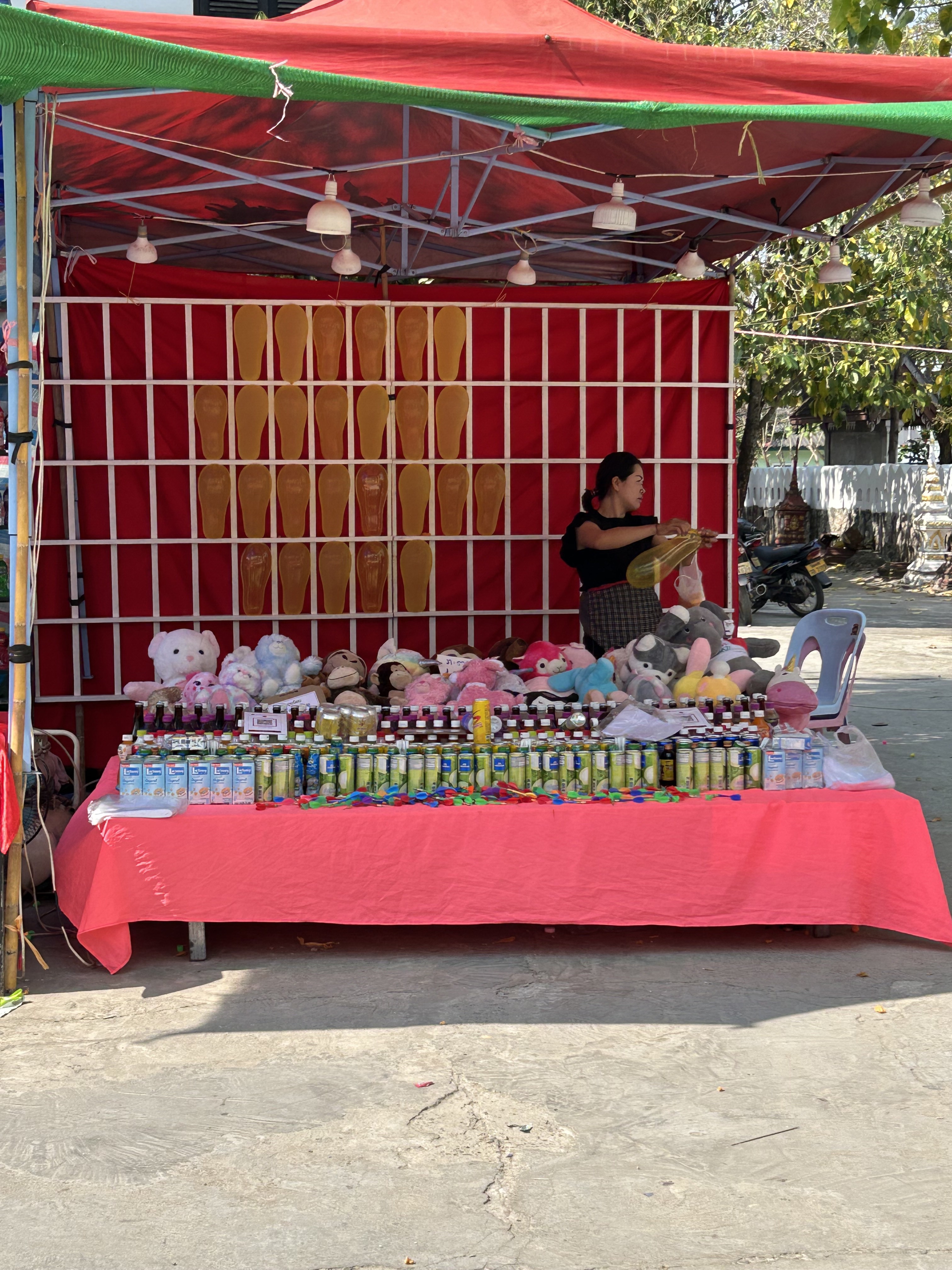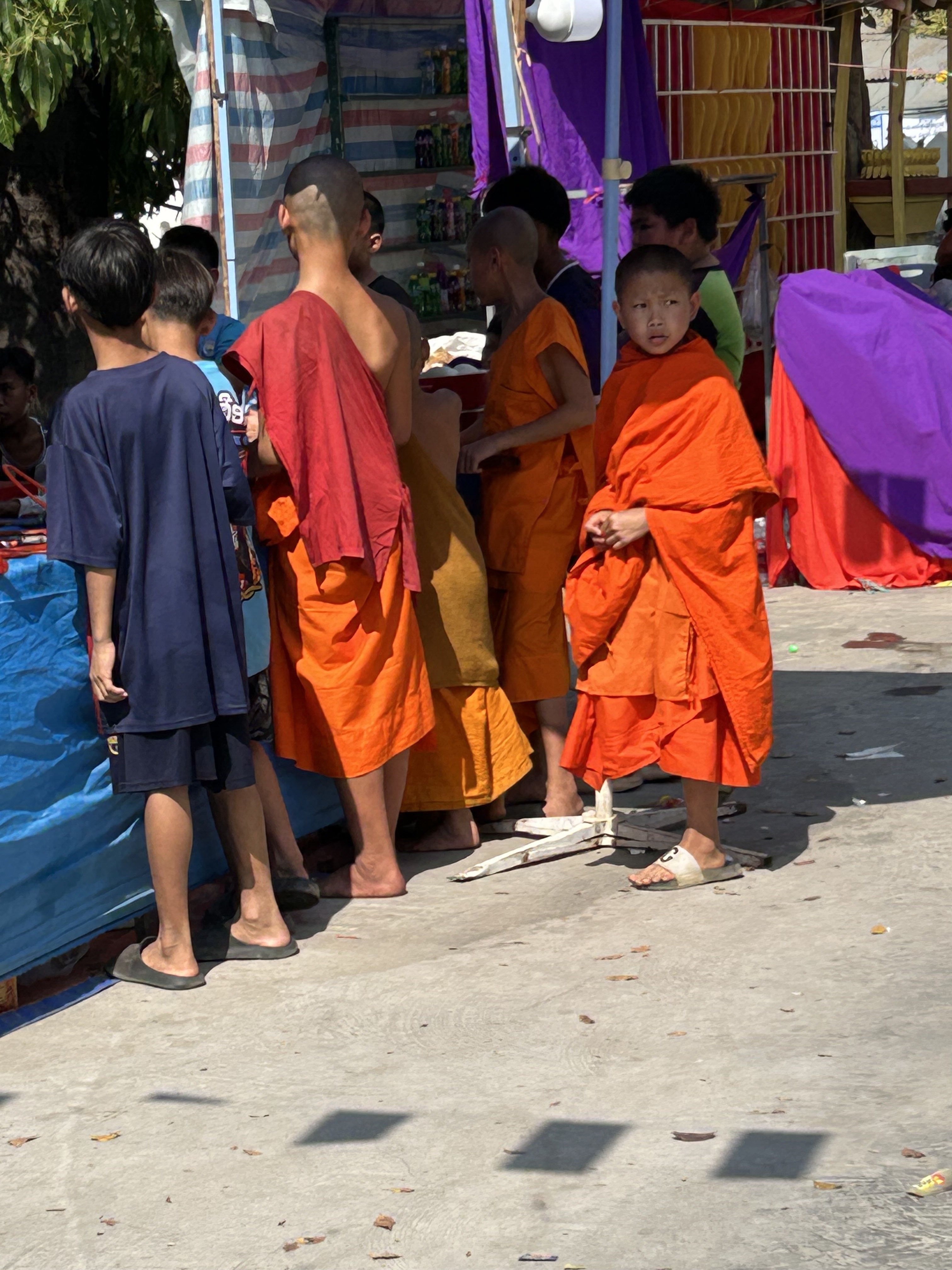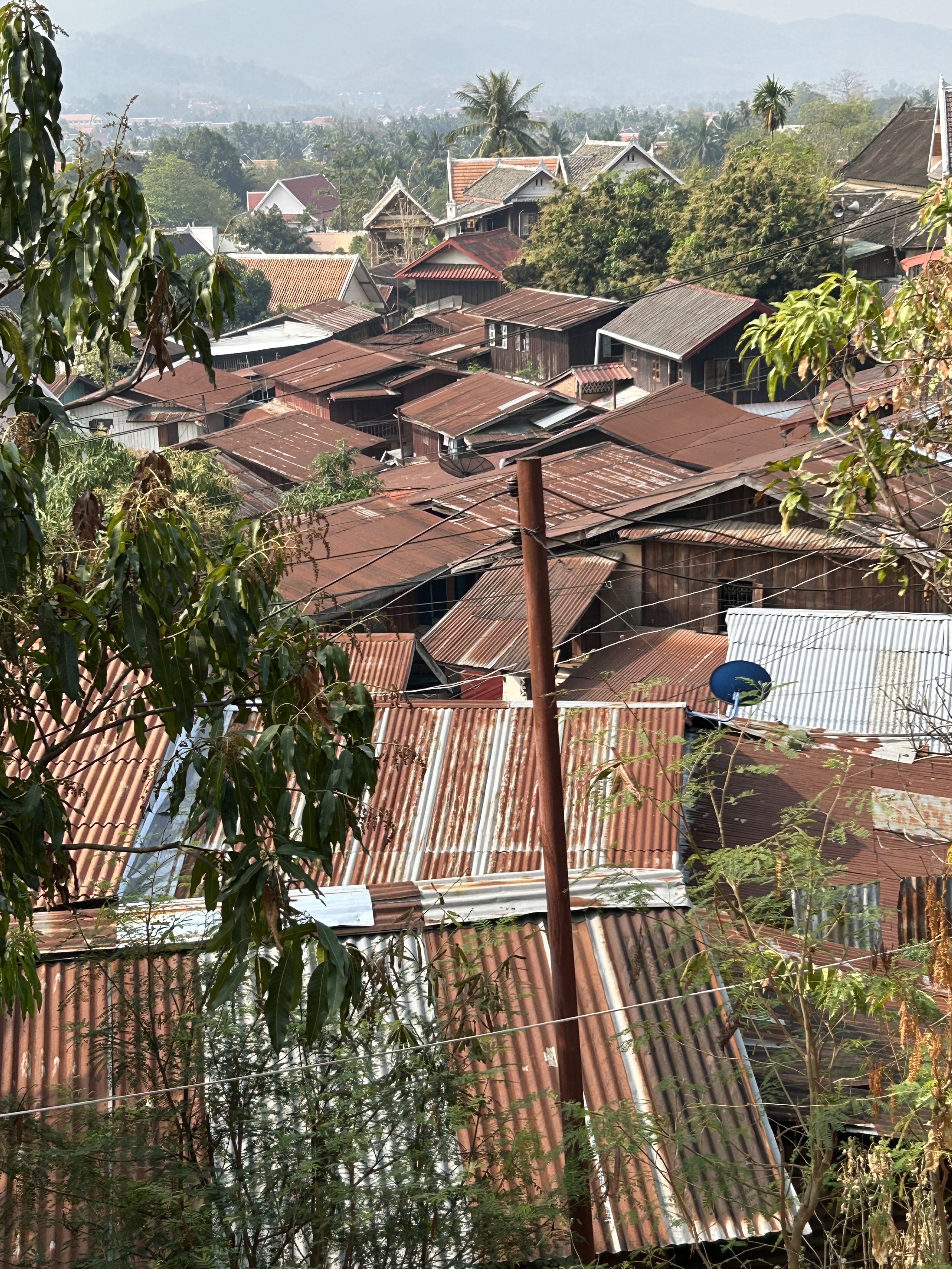 The last thing we did was wander through the town one last time and up and over the big hill in the middle along some back streets with women making pork patties amid a small patchwork sea of corrugated roofs. This took us to the grounds of a large temple where there was an annual ceremony, marking Buddha’s death, that involves a continuous three day reading of his teachings and Buddhist history coupled, as though to reflect Buddha’s recommendation of a middle path between extreme asceticism and indulgence, with a small fun fair where the little Buddhist novices and civilian kids alike could try their hand at popping balloons with darts or shooting pop bottles off a shelf with a pellet gun. Then that was it – poof – the end of our time in lovely Luang Prabang.
