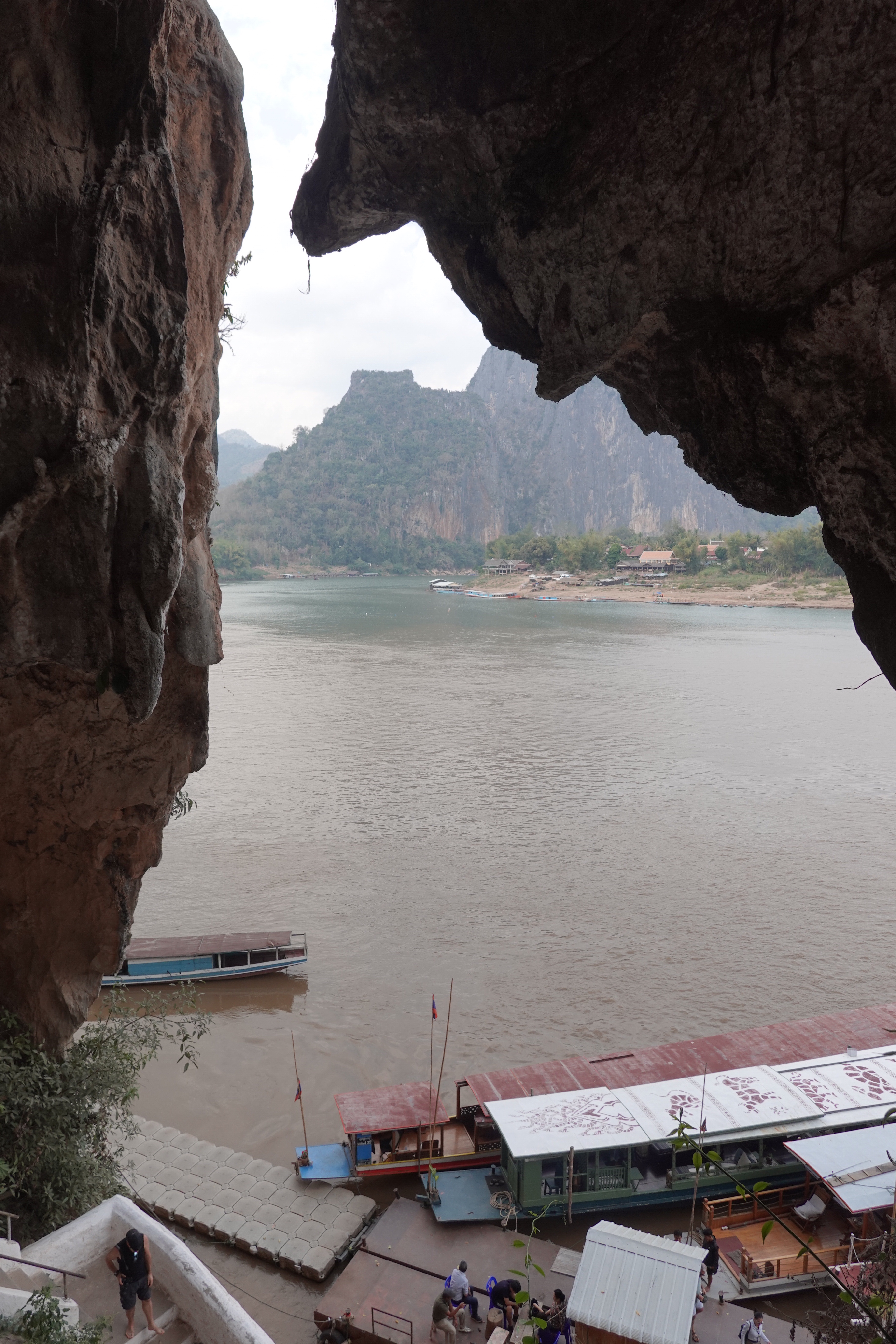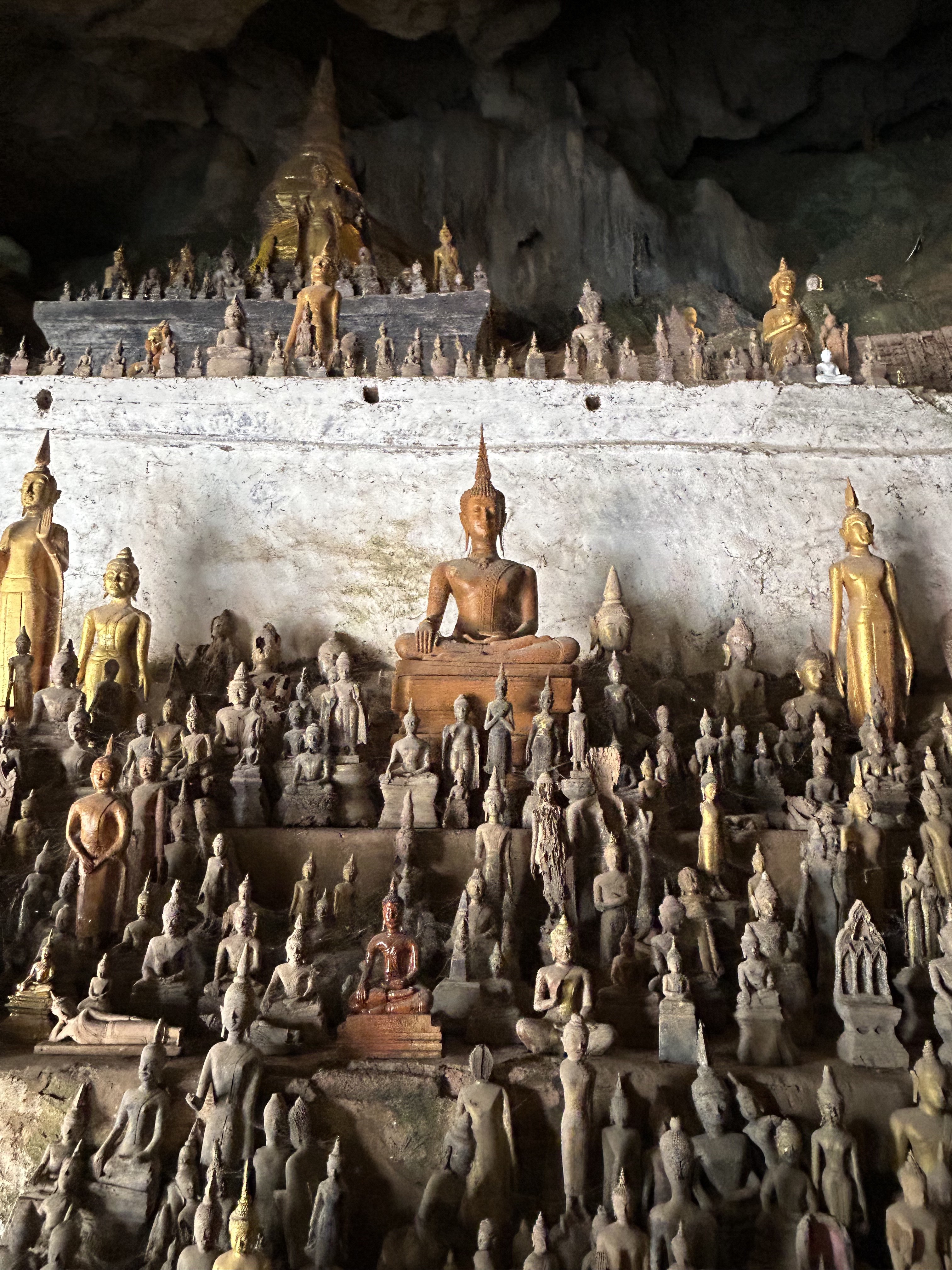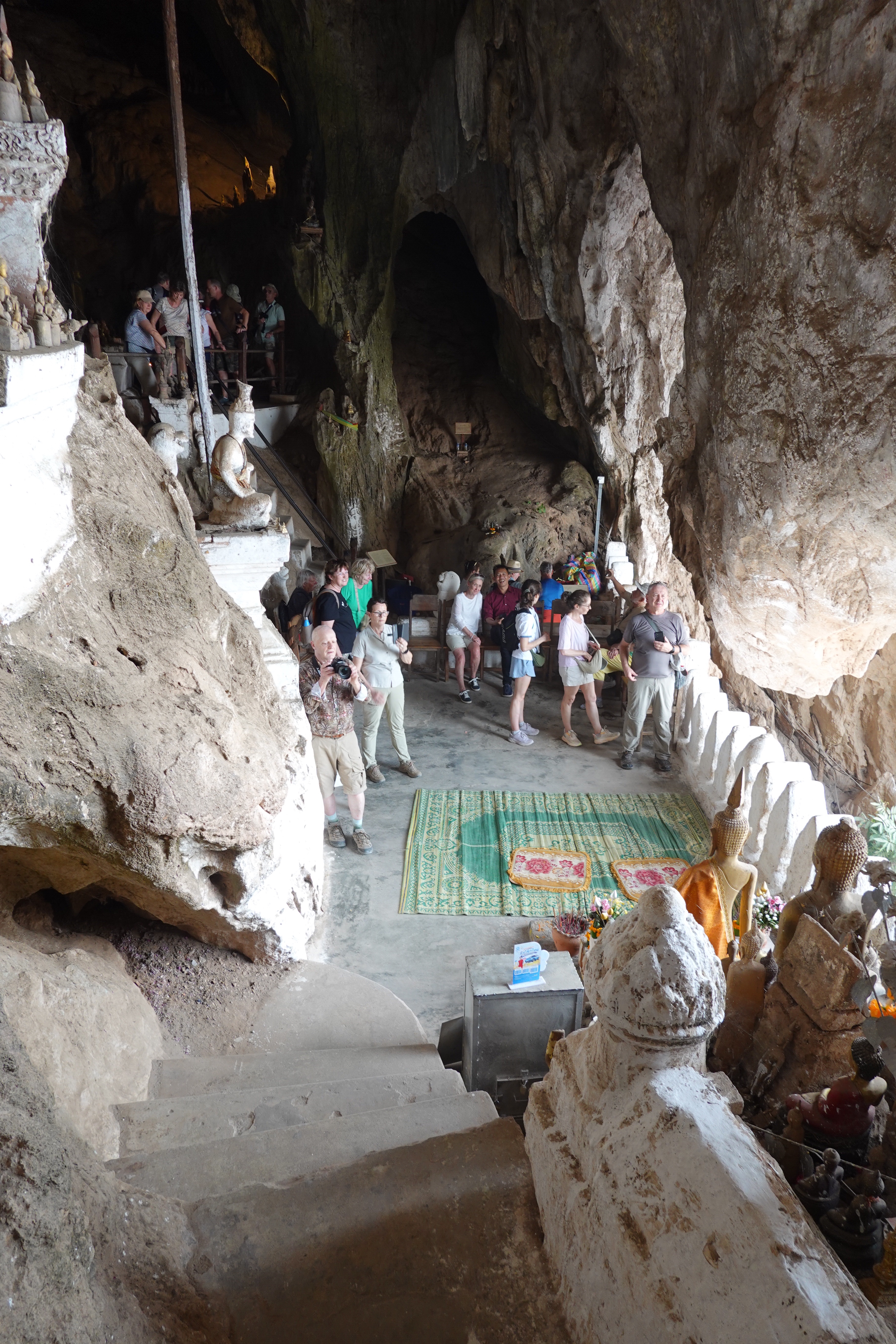 The good take-always from Luang Prabang and thereabouts are legion. Many were from nature. There are the elephants, of course, watched over by their one-on-one mahouts and with their leathery trunks unexpectedly softer underneath and the delicate way they can pick up, fold, and tuck stalks and leaves into their mouths. There was the much touted boat ride from the elephant camp up the Khan River to “the waterfall” which, we were told just before heading off, had no water because it was the dry season but would we like to see it anyway? There was the real year-round waterfall that cascaded down through the jungle to the delight of the vast milling crowds who had apparently never seen a waterfall before. And there was a lazy trip up the Mekong for an hour or two to see some caves into which people keep putting more and more Buddhas each year and which made for a bizarre destination that justified a lovely afternoon watching boats, fishermen, water buffalo and scenery.