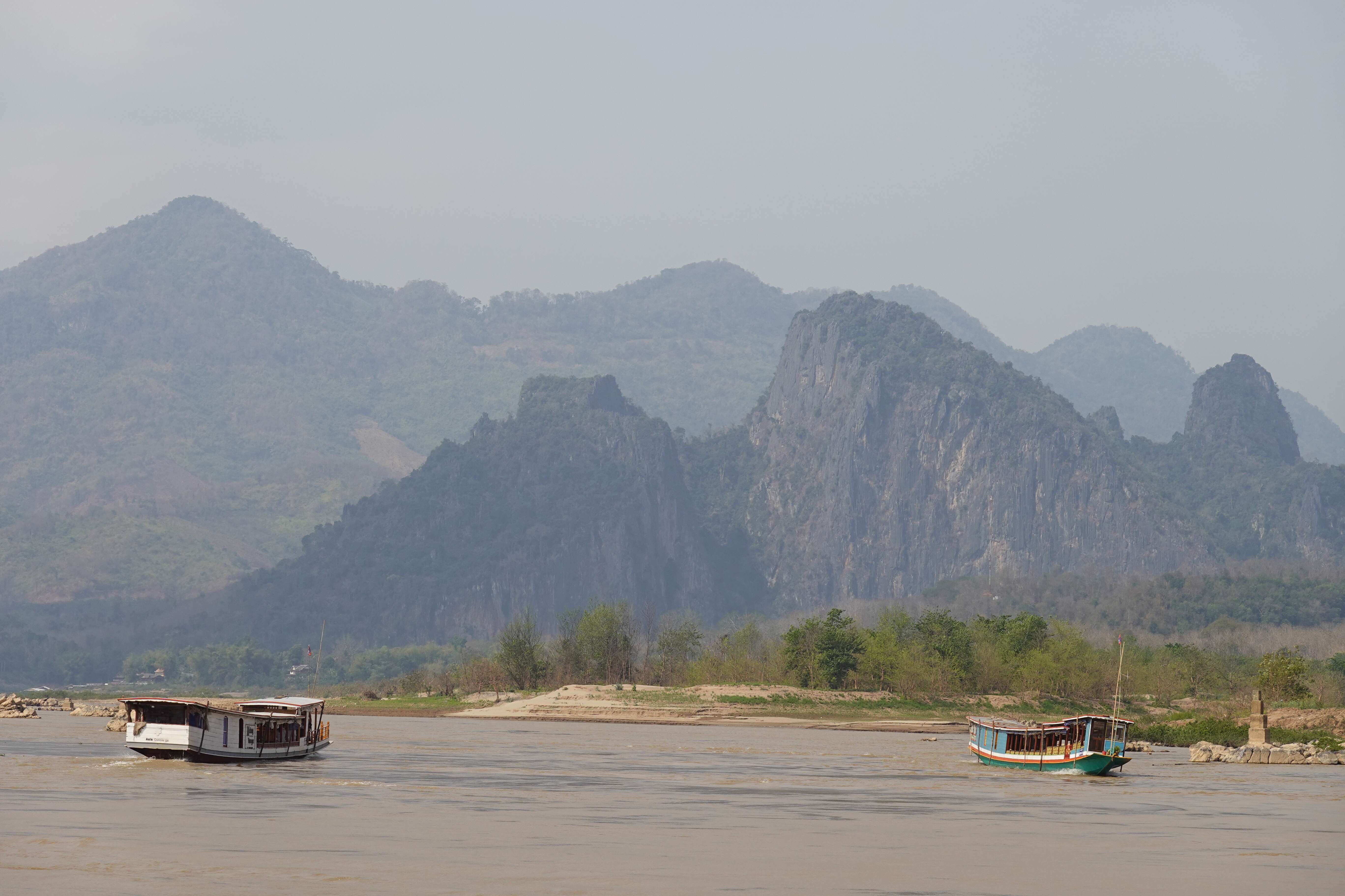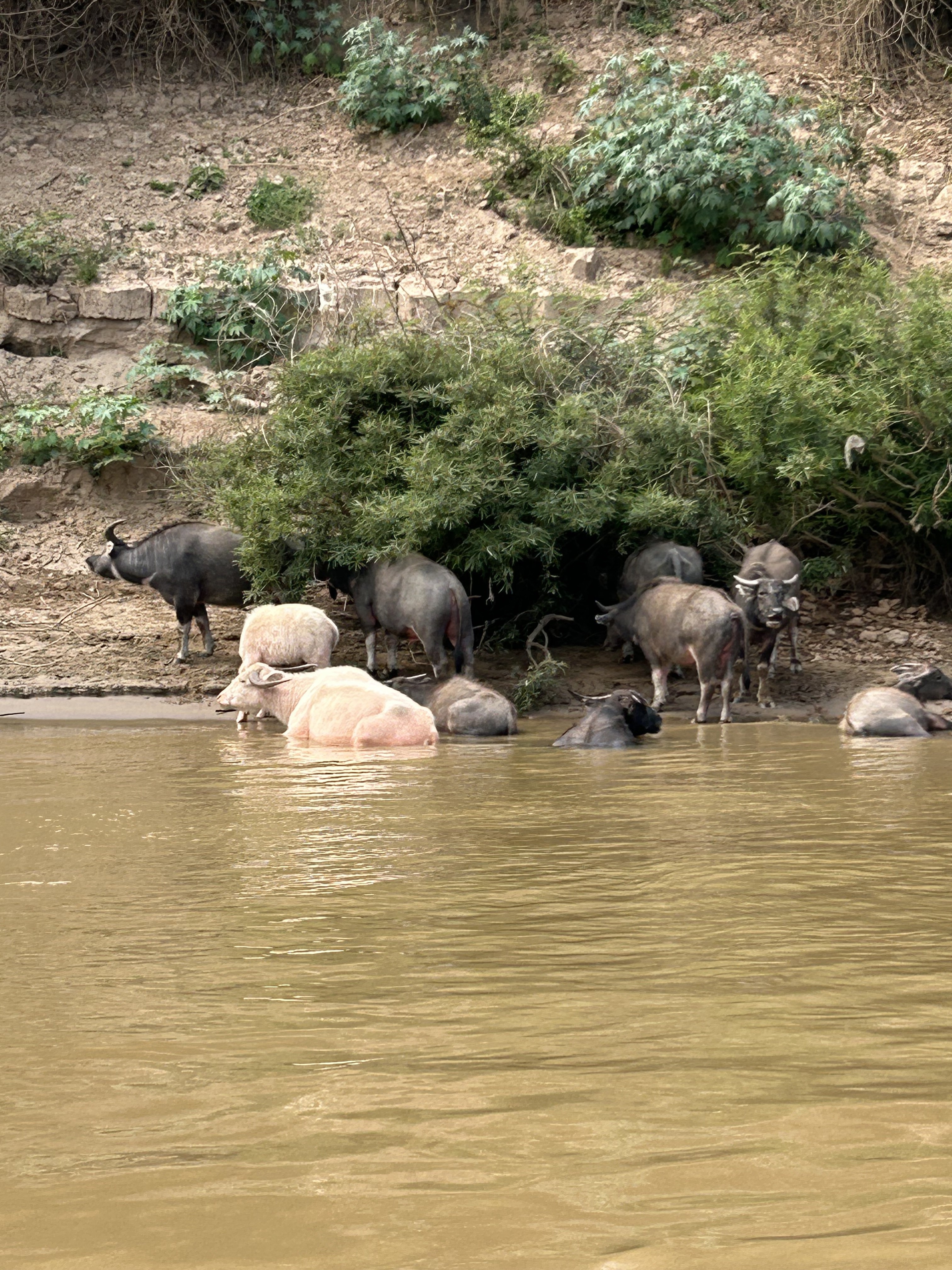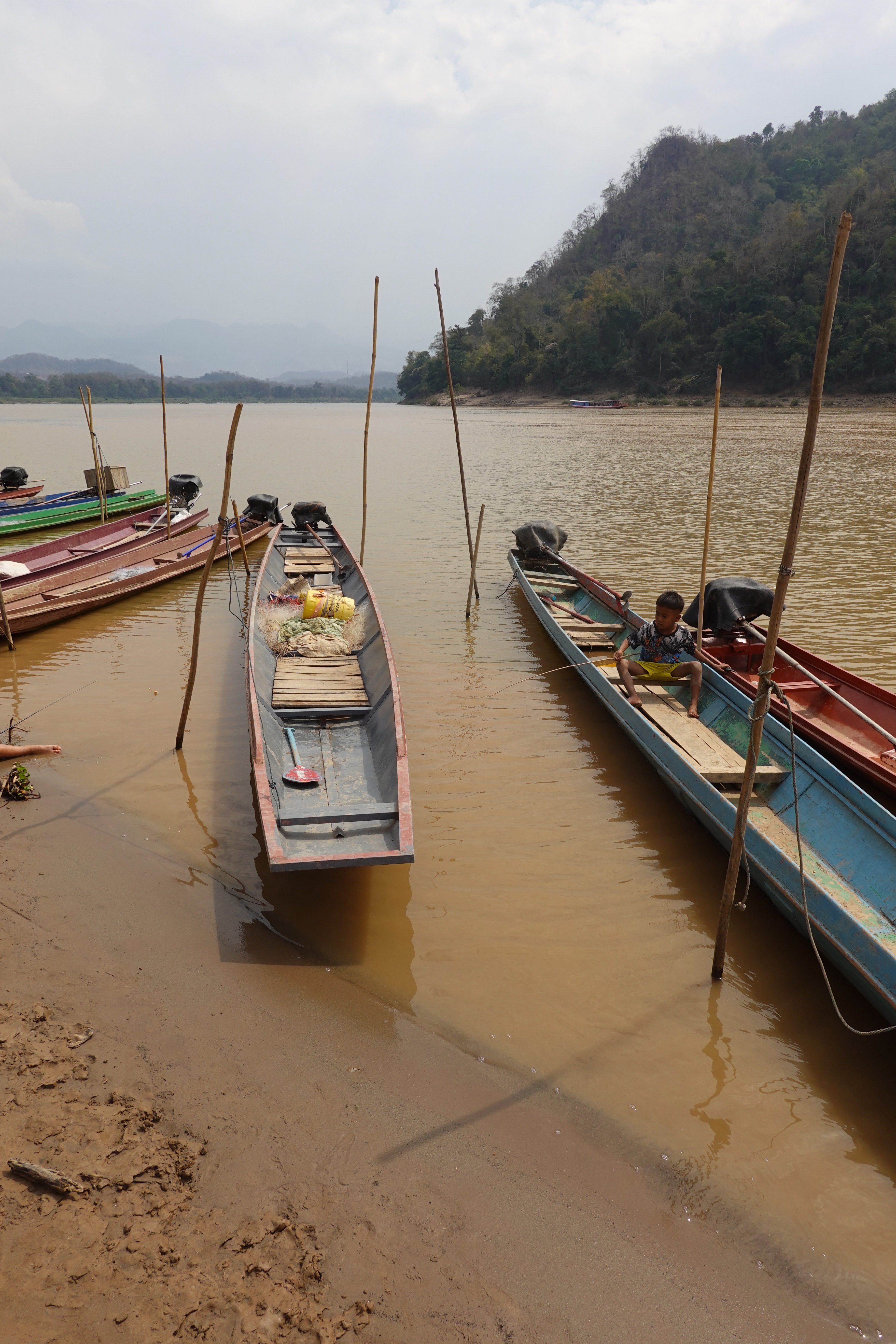 The good take-always from Luang Prabang and thereabouts are legion. Many were from nature. There are the elephants, of course, watched over by their one-on-one mahouts and with their leathery trunks unexpectedly softer underneath and the delicate way they can pick up, fold, and tuck stalks and leaves into their mouths. There was the much touted boat ride from the elephant camp up the Khan River to “the waterfall” which, we were told just before heading off, had no water because it was the dry season but would we like to see it anyway? There was the real year-round waterfall that cascaded down through the jungle to the delight of the vast milling crowds who had apparently never seen a waterfall before. And there was a lazy trip up the Mekong for an hour or two to see some caves into which people keep putting more and more Buddhas each year and which made for a bizarre destination that justified a lovely afternoon watching boats, fishermen, water buffalo and scenery.