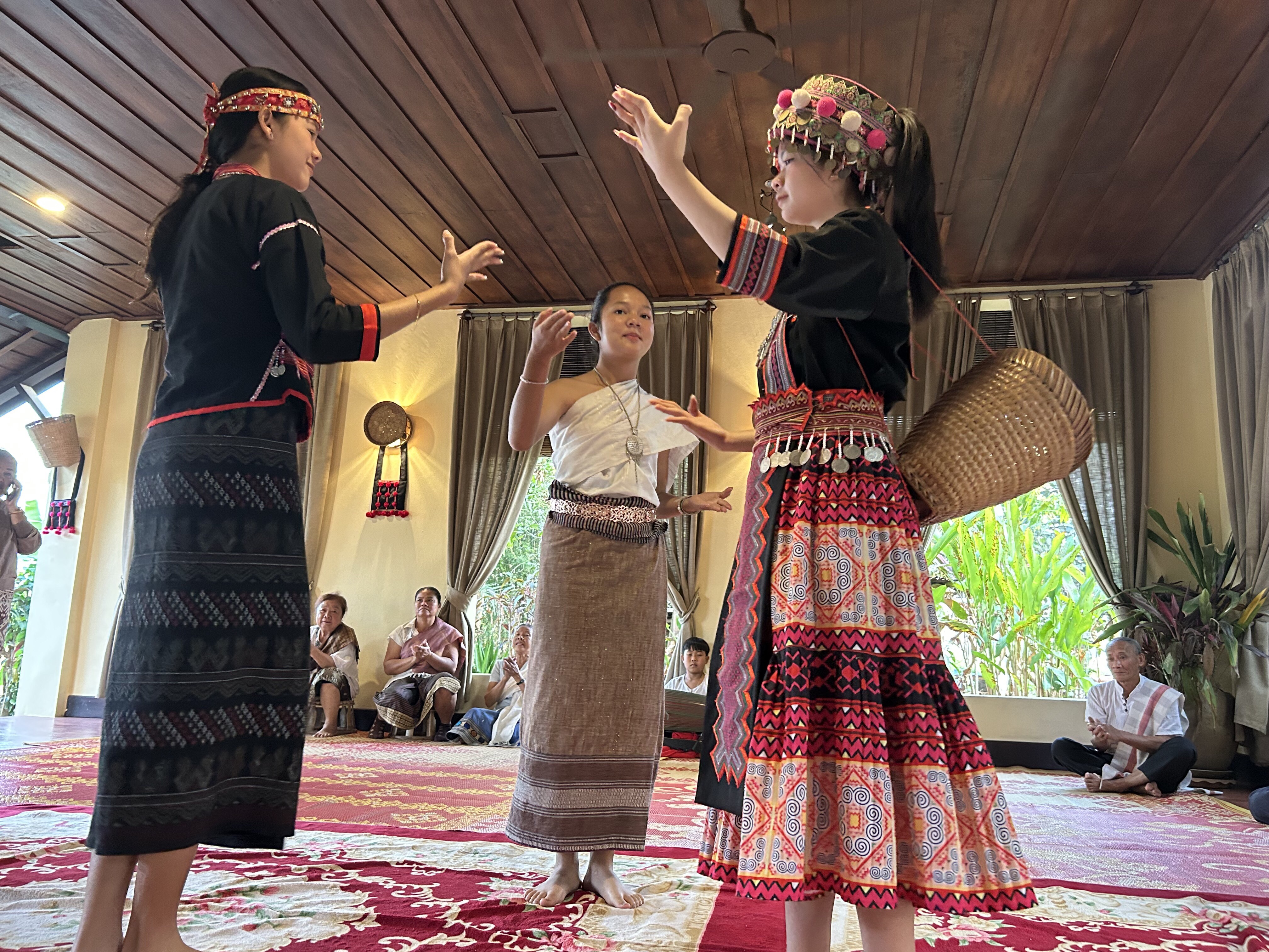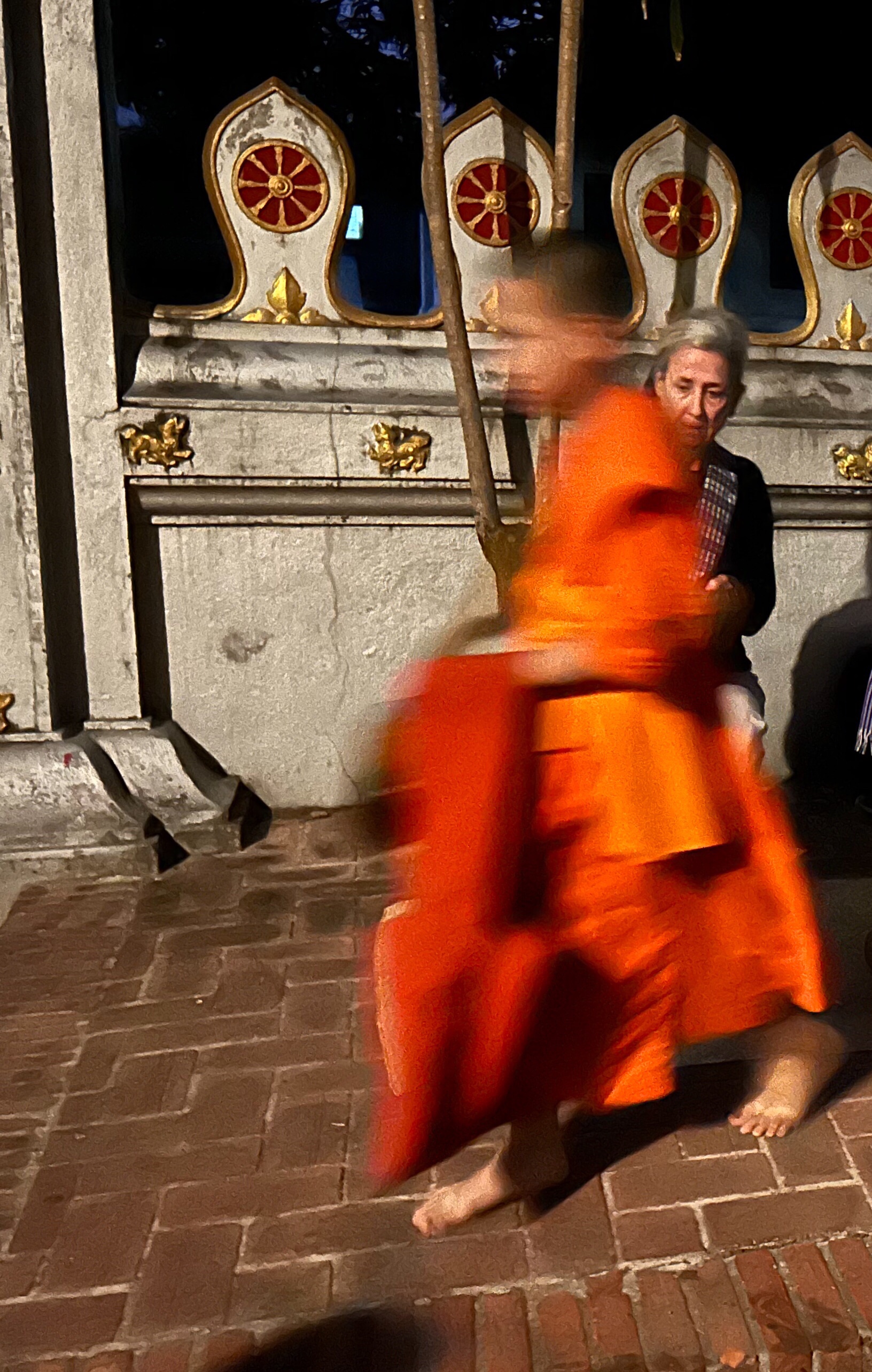 And some of the good take-aways were people. We went to a little dance recital by students dancing the dances of the many “tribes” living in the valleys and on the hills of northern Lao, held in a family’s house where the entire extended family blessed us, one by one, and then sat around the periphery cheering on the dancers. We also went out into the pre-dawn dark to join the locals and the other tourists giving the daily alms to the monks. I had worried that we would be intruders in this ritual, but in the end it did not feel that way. We bought sticky rice and something rolled up in banana leaves from a woman who makes her living this way, and the interaction with the 40 or so monks who came by in four lines Across about half an hour from four different nearby temples felt respectful and even useful. There was no sense of charity in what I think of as the western sense, with its notion of the less fortunate – instead, this felt like part of an overall material and spiritual ecosystem in which one shares and evens things out a bit and if good karma comes of that so be it – it beats the bad karma that comes, maybe more quickly, from failing to do one’s part.