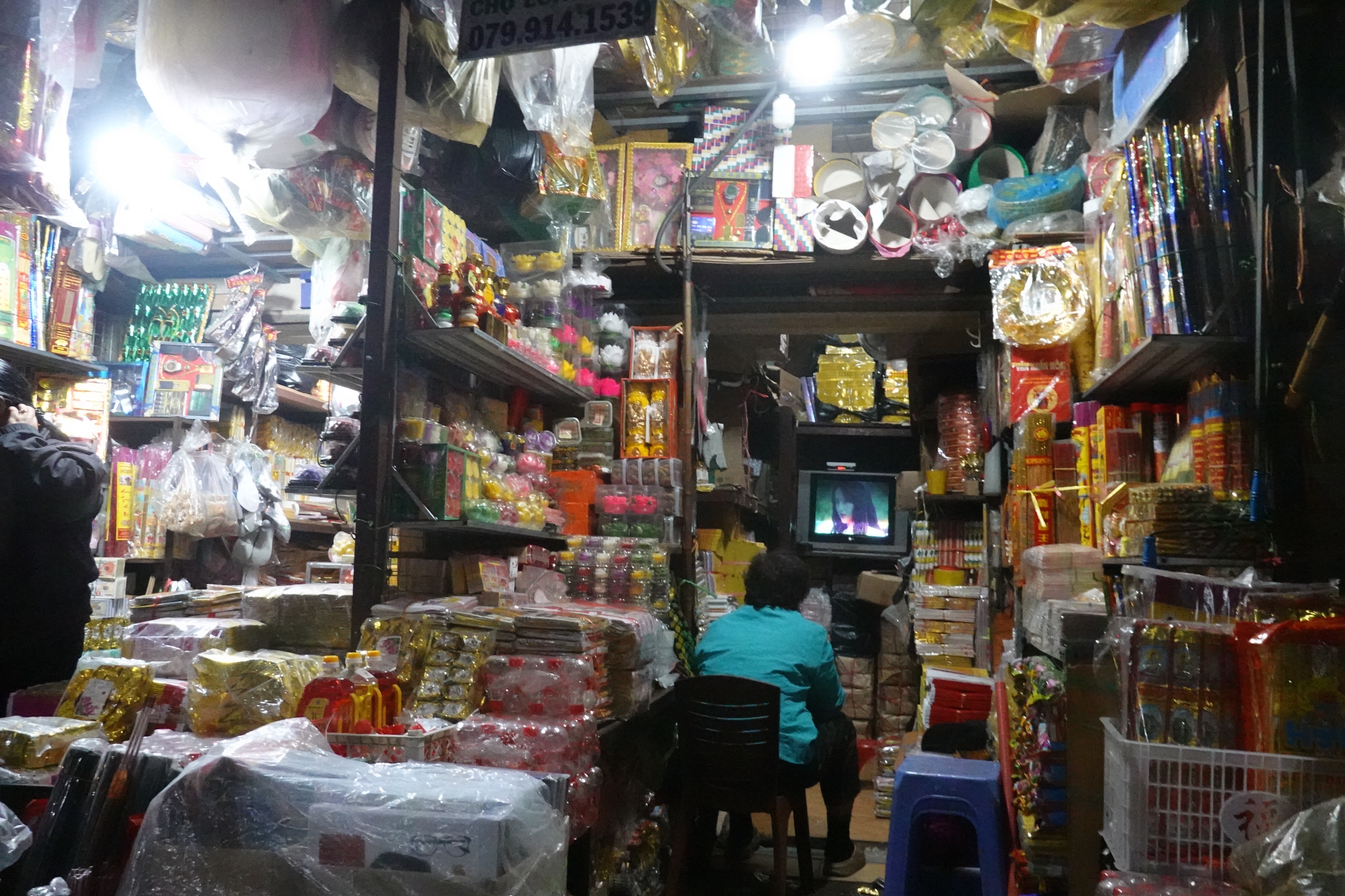 But I like to look at the people in all this. The woman selling nothing but bananas on the sidewalk; vendors in the wholesale market doggedly emptying large crates of yet more fruit; the buyers standing in the rain among the detritus, haggling for a better deal; the woman in her shrine to packaged decorations watching early morning TV; the woman on a scooter with huge bags of greens hanging off every conceivable carrying point; the cop chatting up a sidewalk vendor in the neighbourhood market, who is quite probably illegal but whose transgression is overlooked in an economy that our guide refers to as “flexible”; the woman cleaning shrimp that will sit out with her other seafood, in what could not be described as refrigeration, until it is all sold; the woman who saw me shooting and fixed me with her baleful glare. They are all here.
