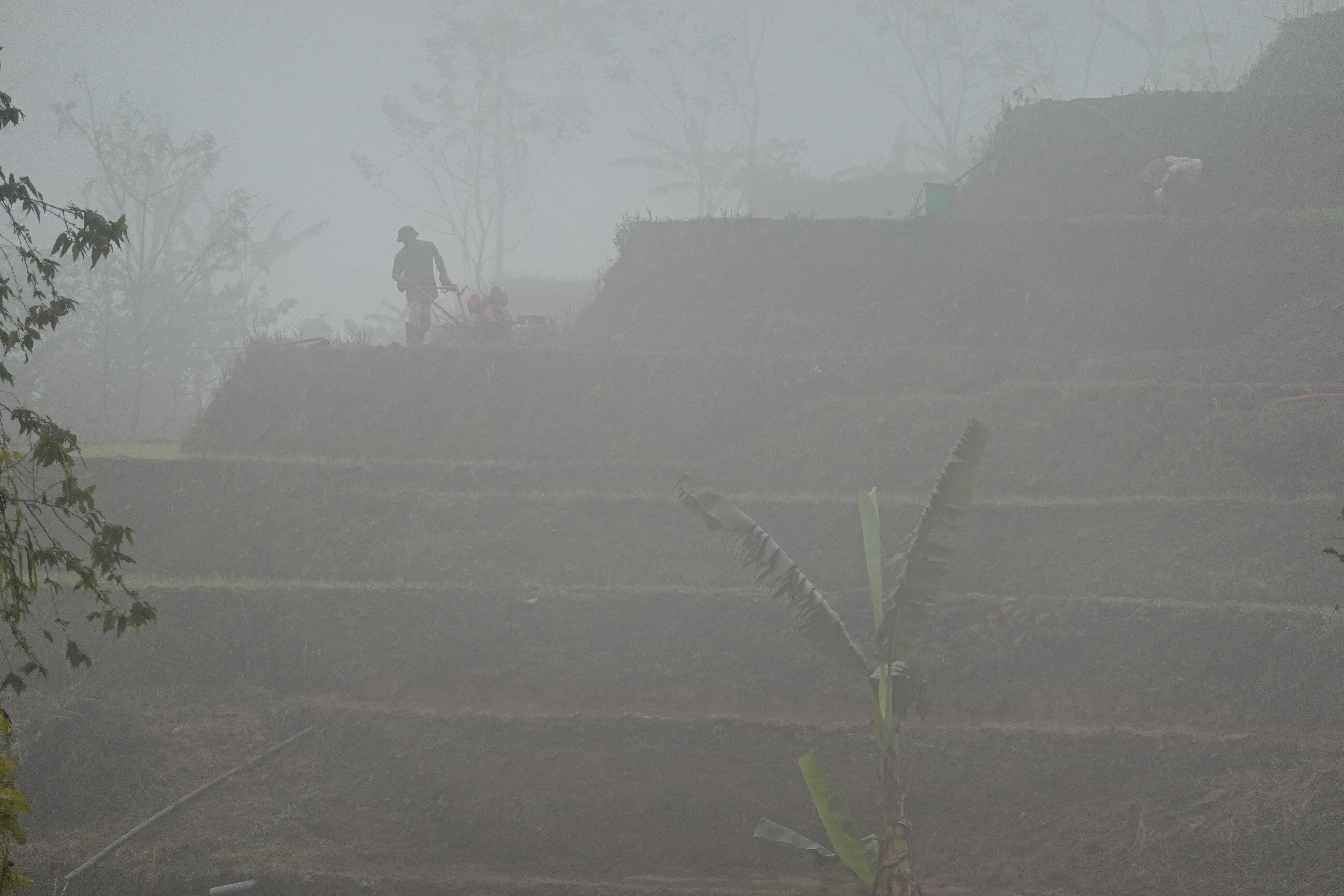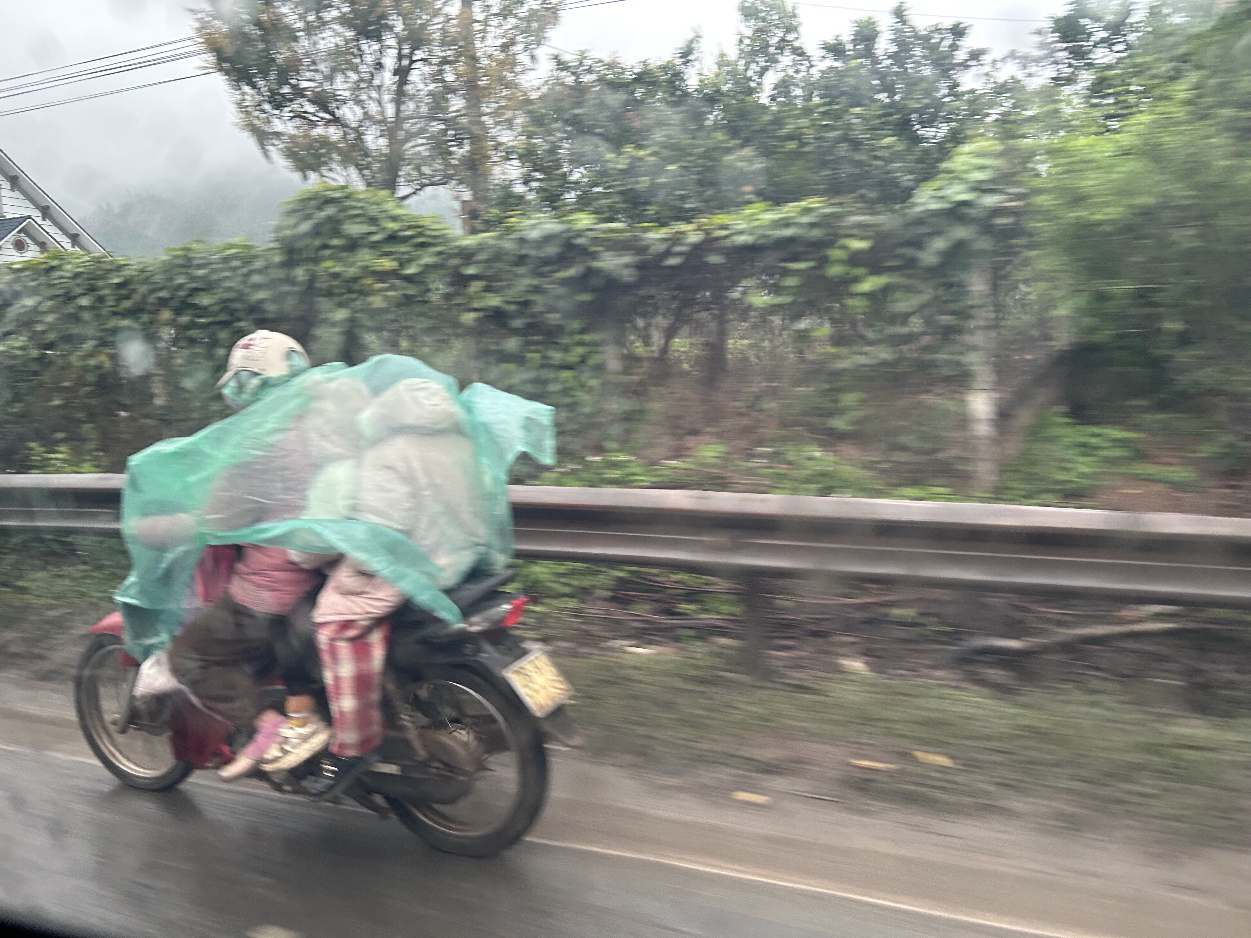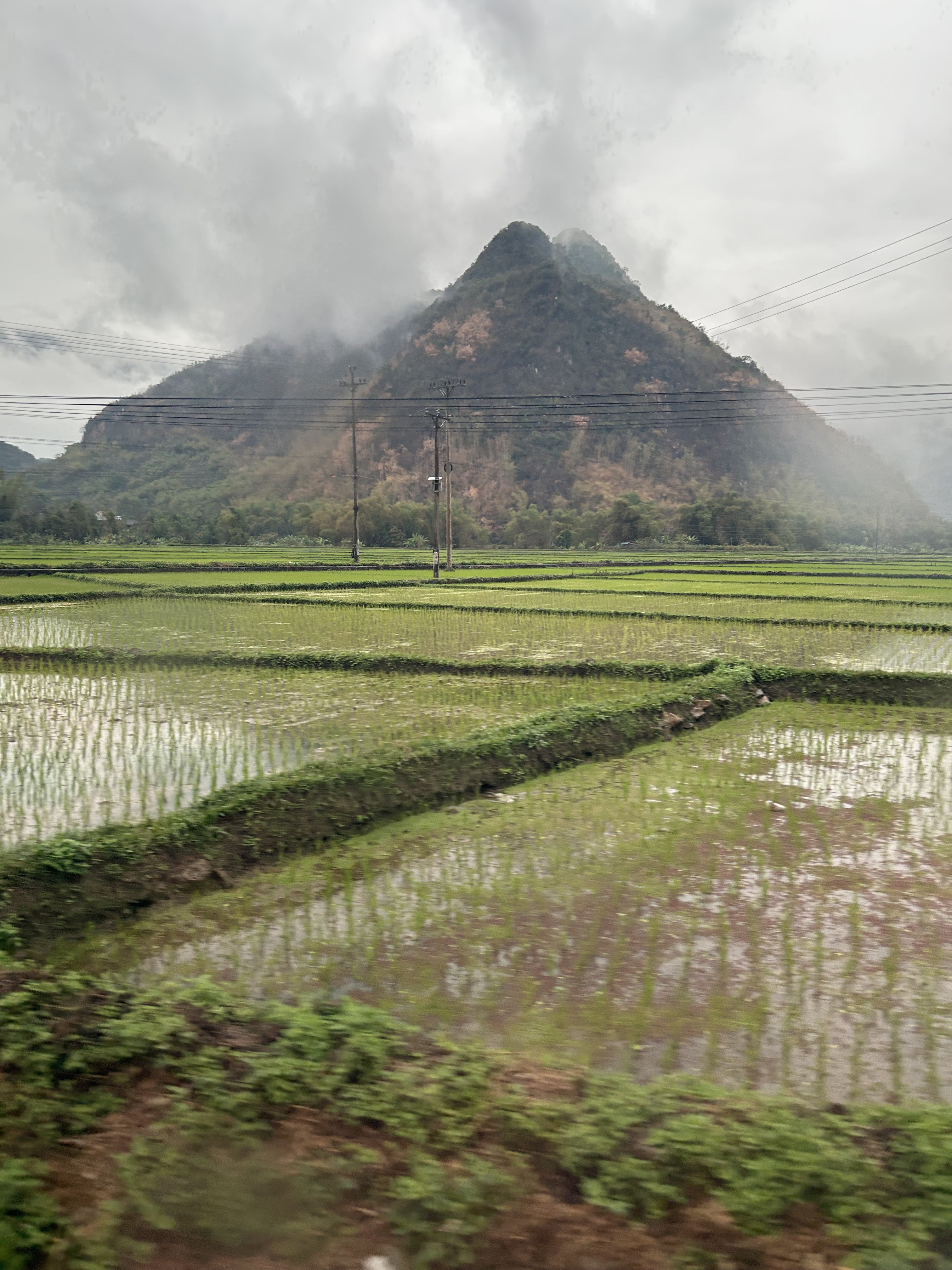 Anyhow, we left Hanoi in the rain, and wisely set off during the morning rush hour. Perhaps “sat” off would be closer. The traffic was not as purely anarchical as in India, but it moved at about the same walking speed, with what looked like impossible bottlenecks slowly resolving themselves into forward motion and scooters moving like water spiders, with one, two (the legal limit), or three or more riders (the law is flexible) sharing rain ponchos that flapped behind them. But eventually we cleared the city, if not the rain. And then saw our first rice fields, which we tried to photograph from the moving car since it seemed unlikely that there could possibly be any more ahead of us…