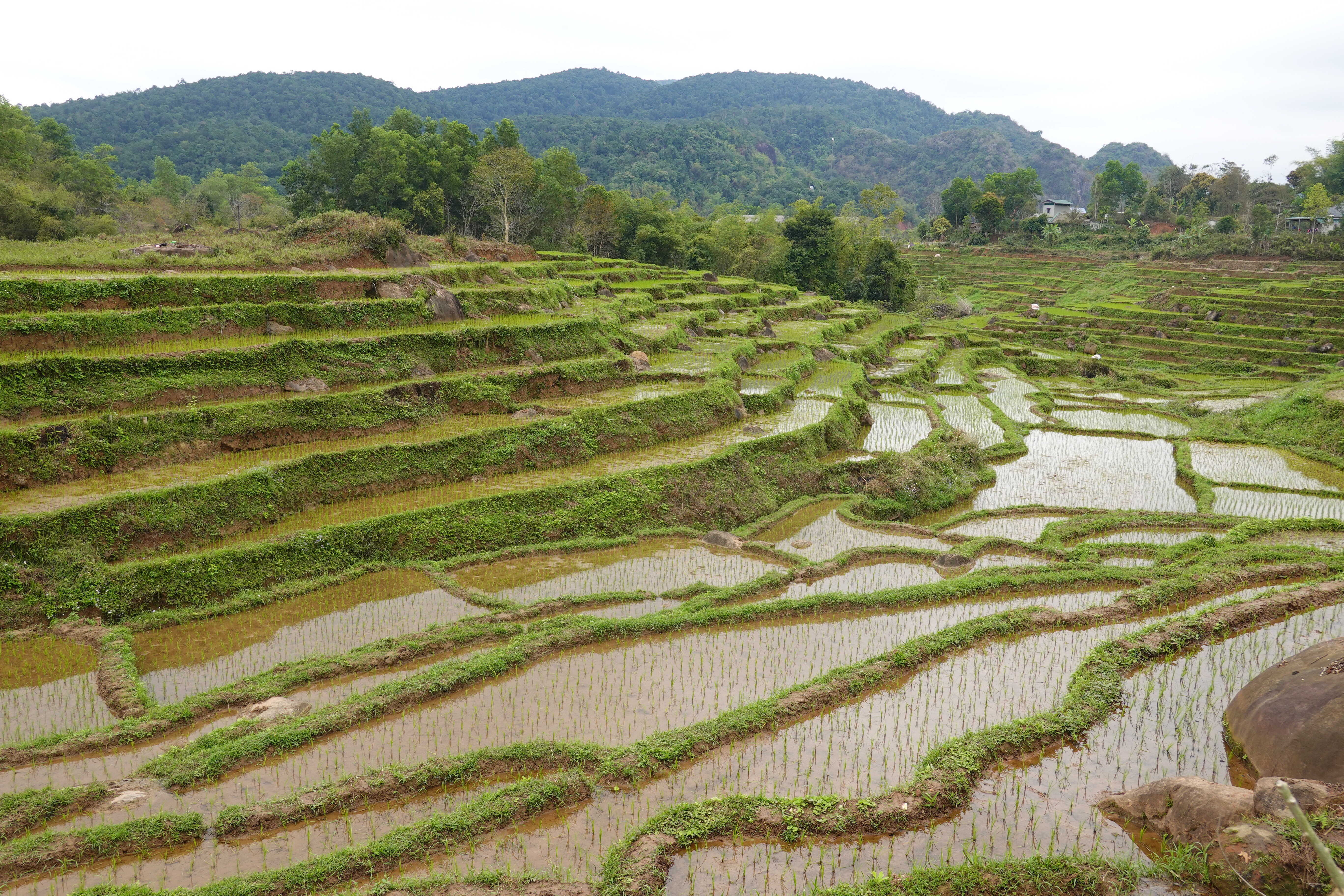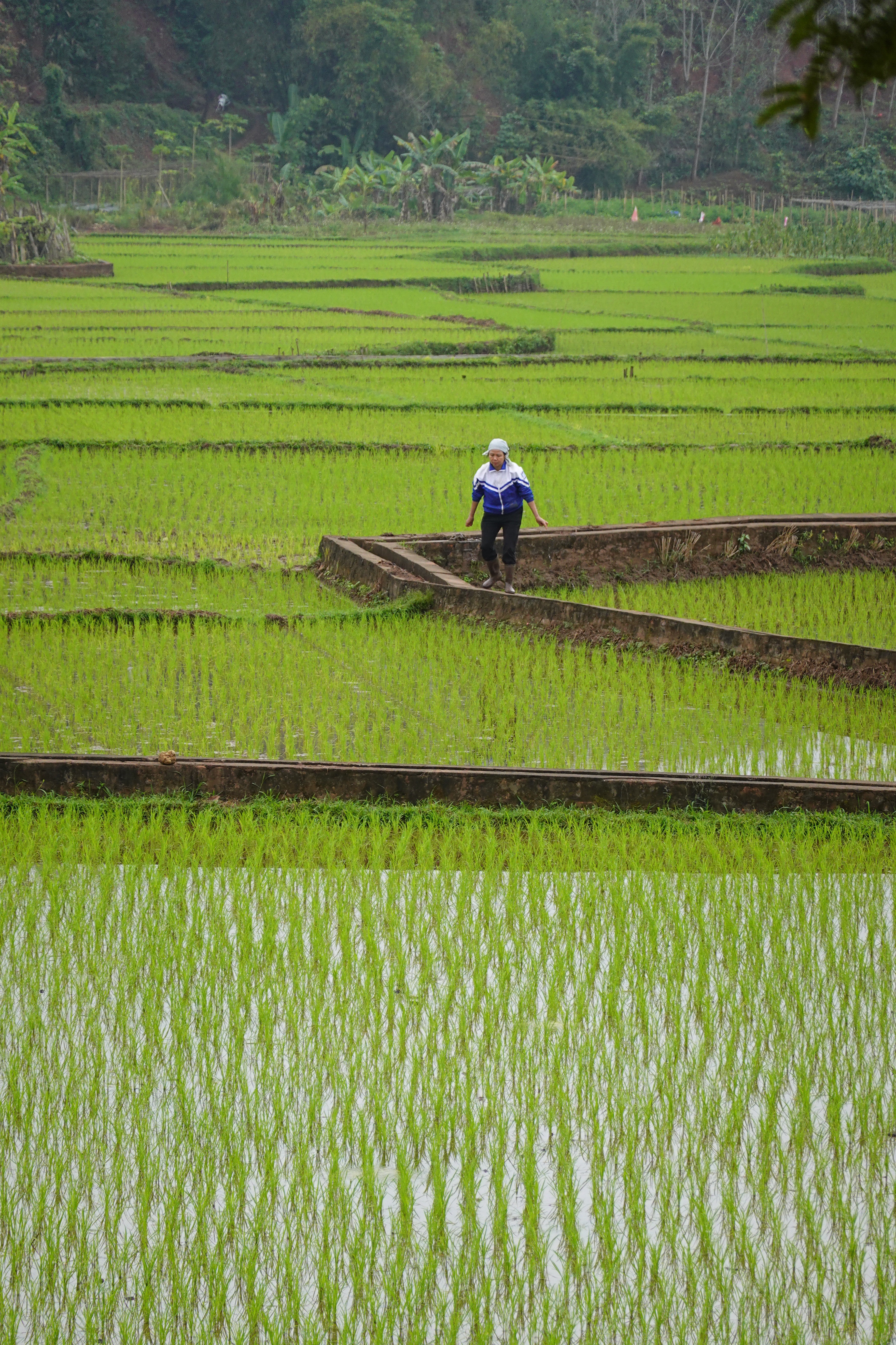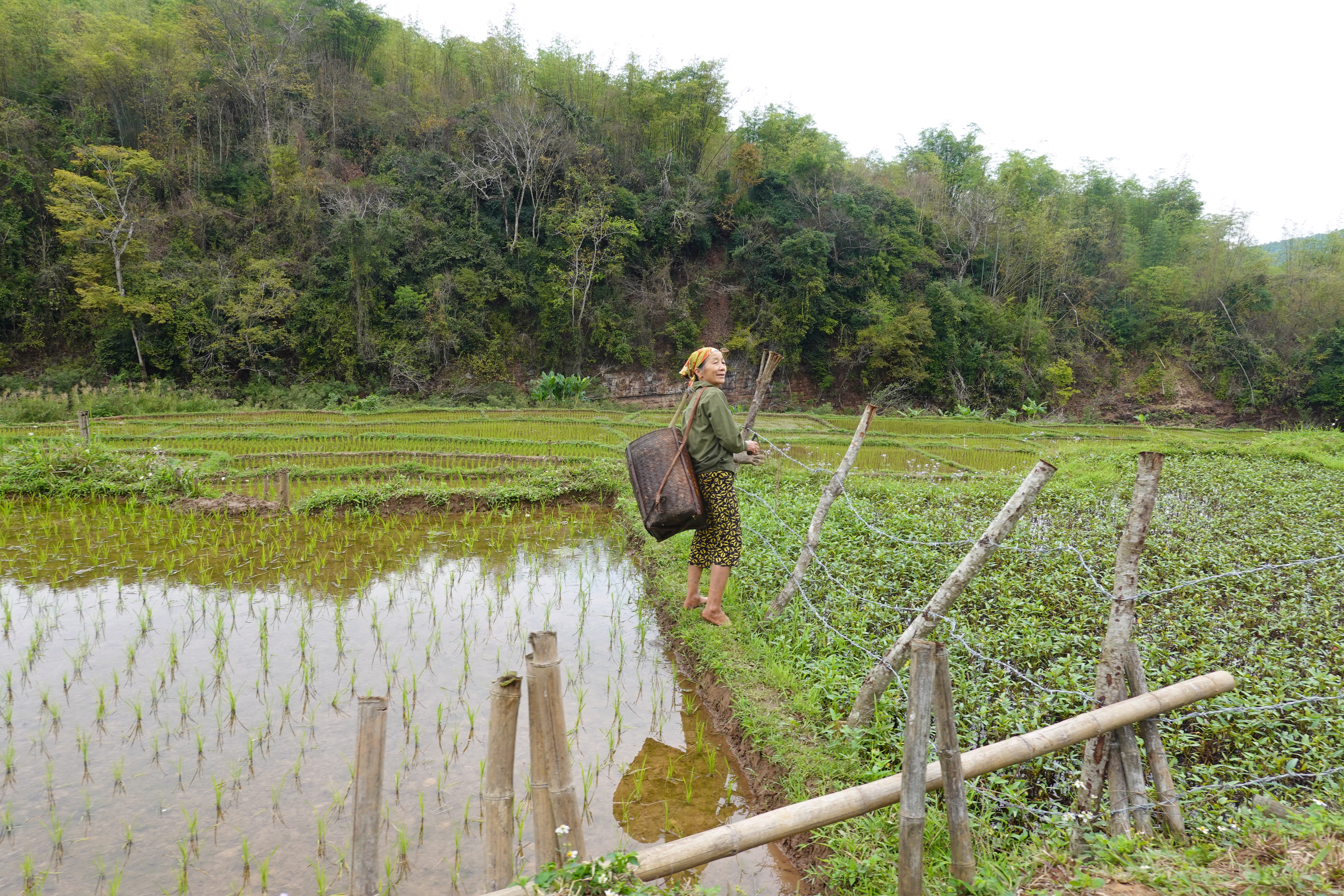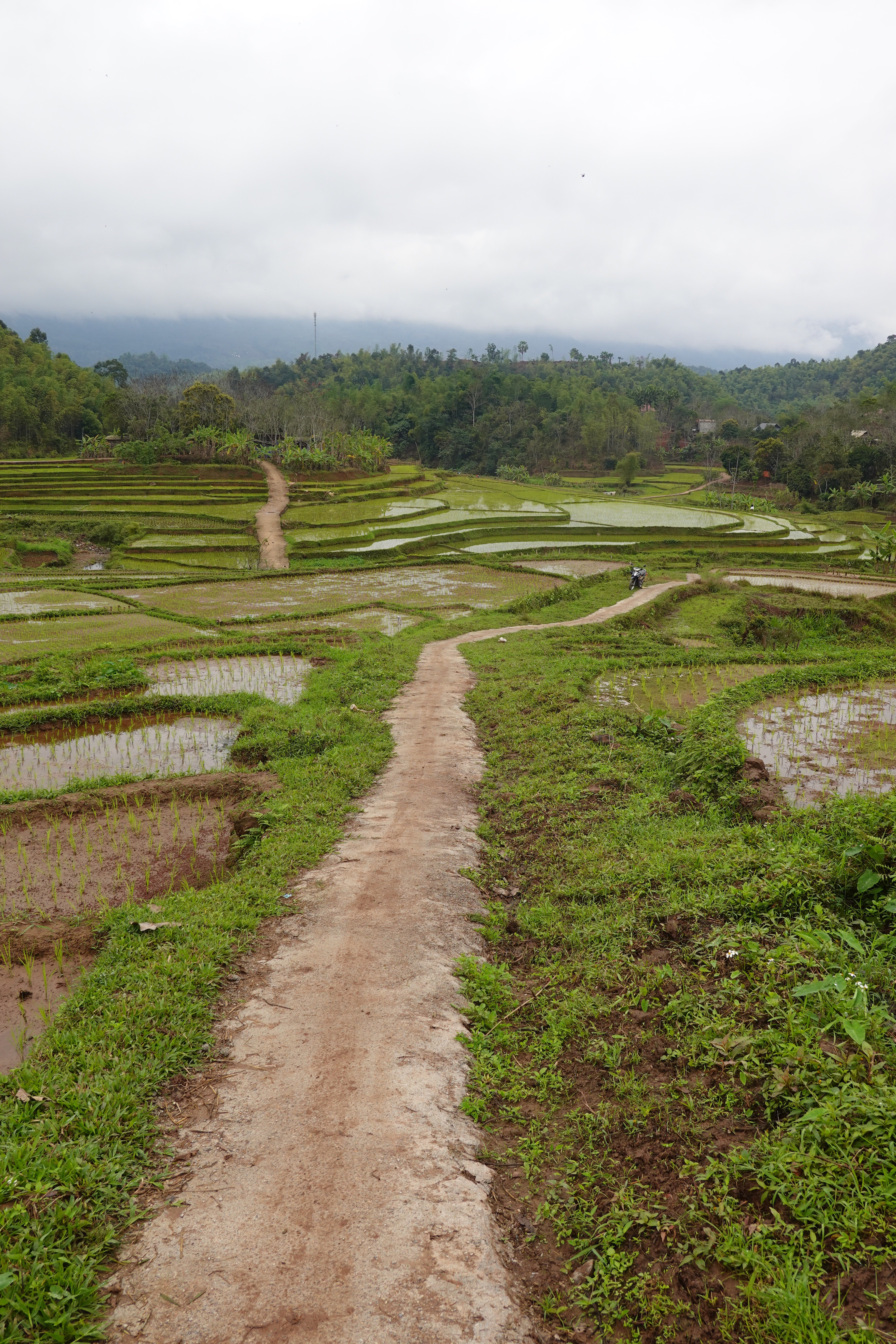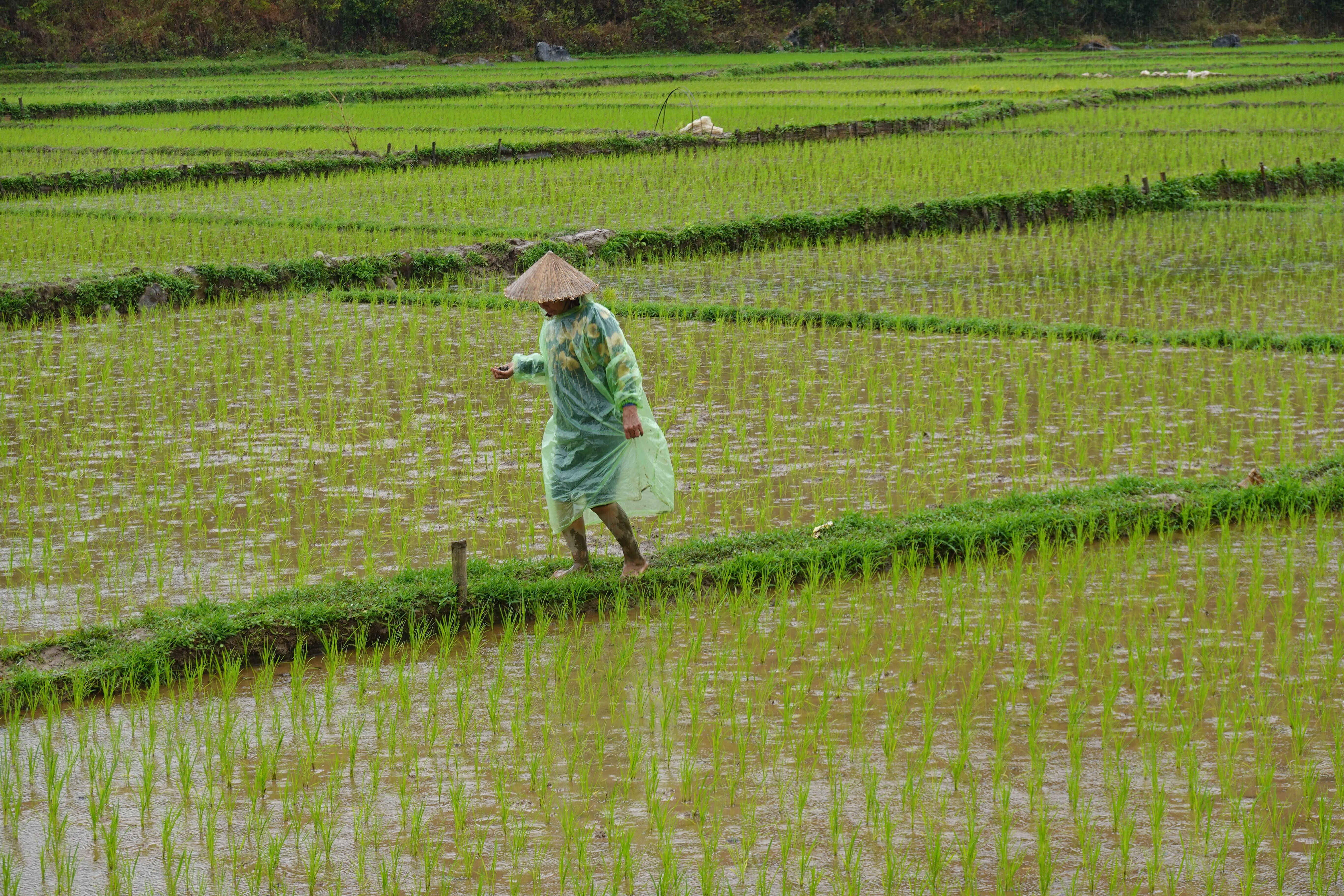 But more there were! We had a chance to walk through one district, in the rain, and then through another the next day in dry but cloudy weather. This is the time of year for planting – so fields were either dry and flat; dry and tilled, either by a kind of rototiller thing or apparently still by water buffalo; flooded; or flooded with small 4-6 inch plants shooting up. Harvest is 90 days after planting, and they get two per year. People out in the fields, in rubber boots or bare feet, were checking the young plants to make sure they were thriving and looking for snails, an invasive problem (they eat the rice plants) from “up north”. Vietnam has many problems that come from “the north”, aka China, but does not like to be specific about naming the source as there is a fraught but critical relationship with the place. Sound familiar? Of course, as there is only one country north of Vietnam, it is not all that ambiguous a description.