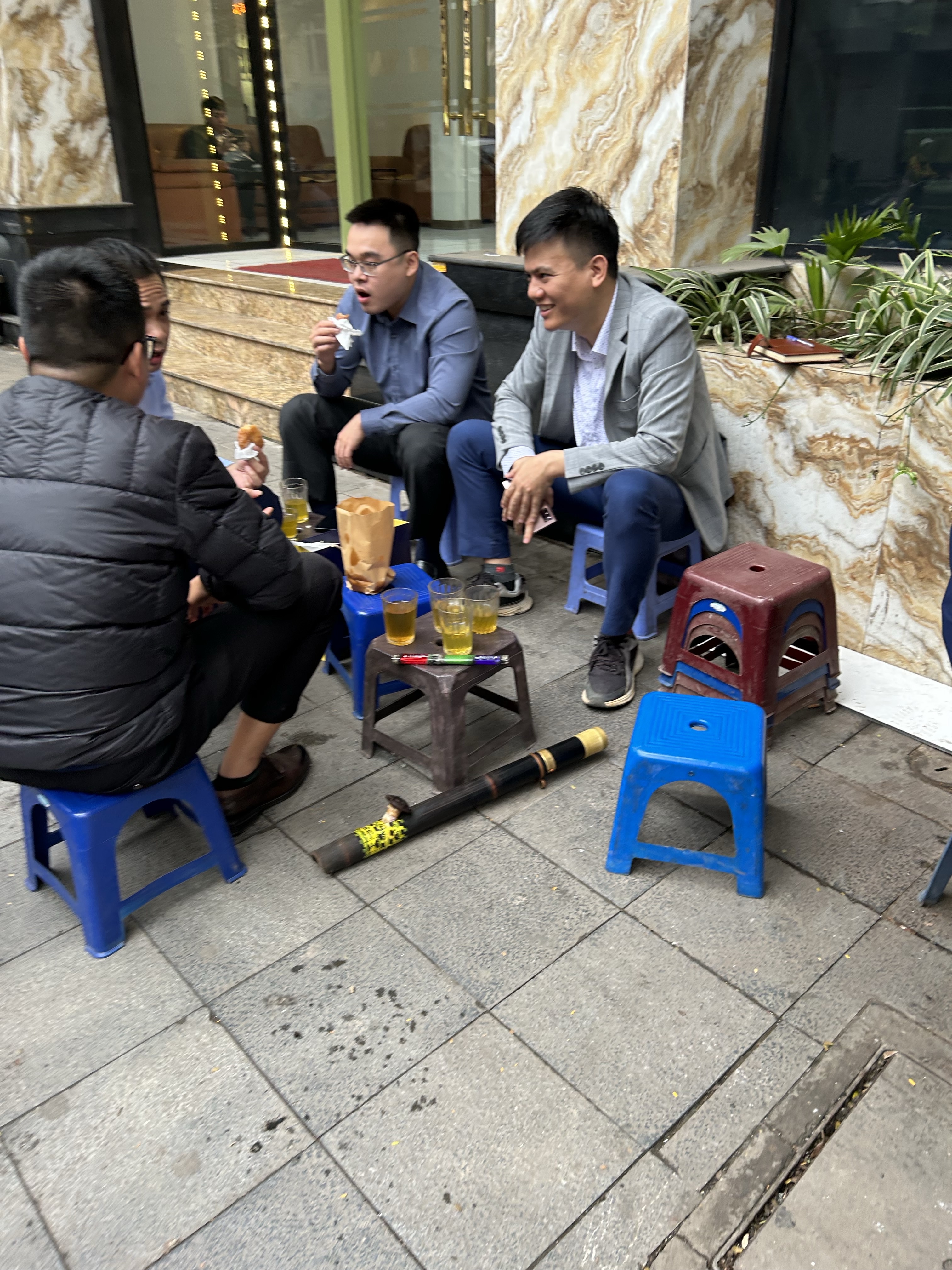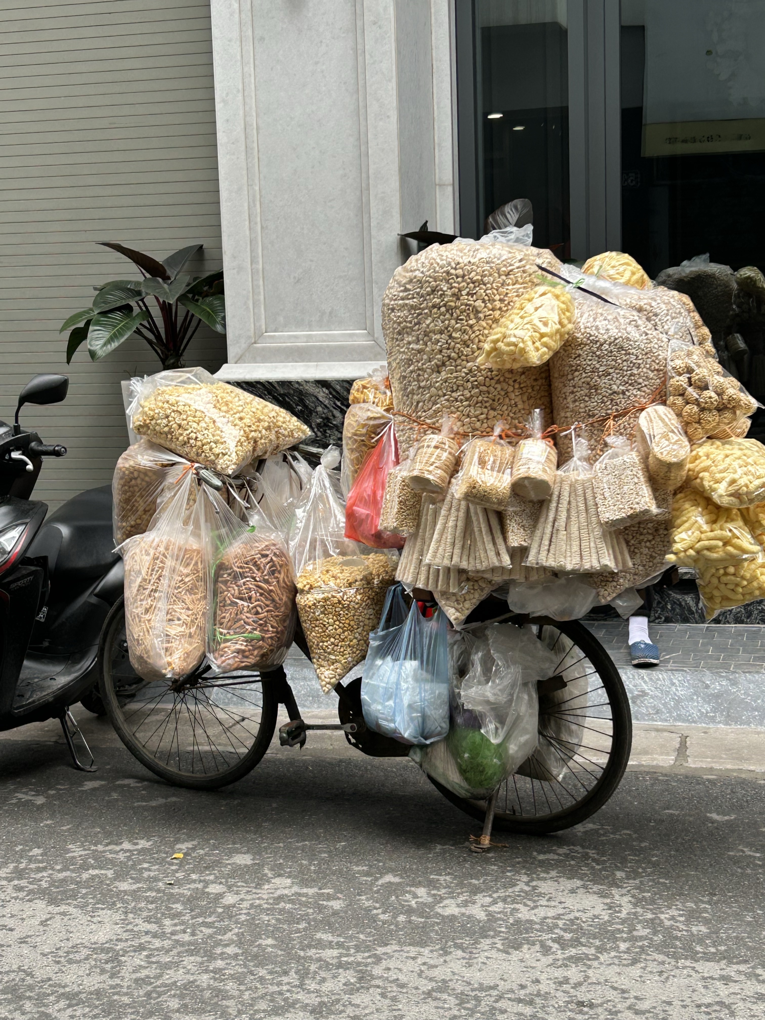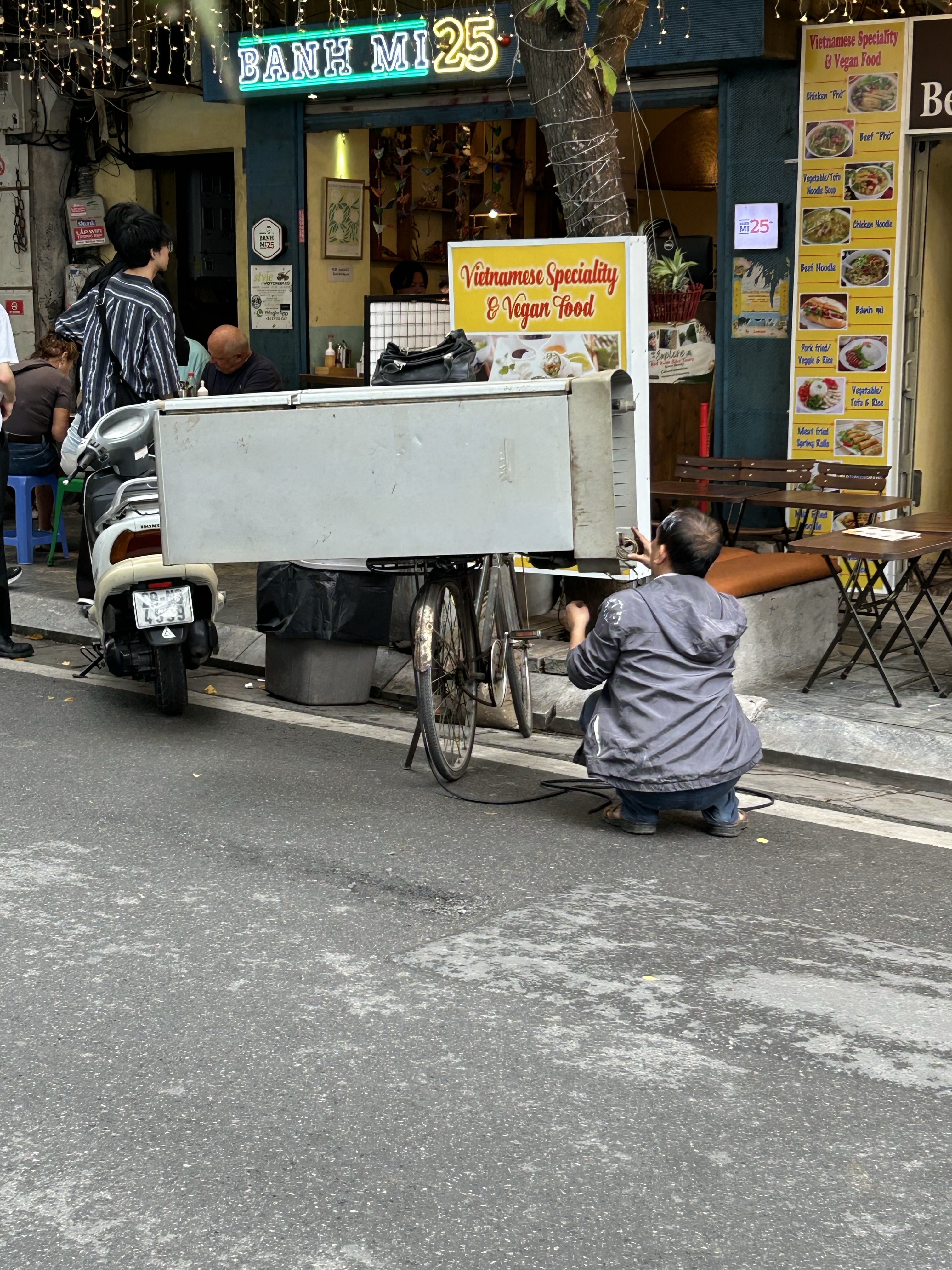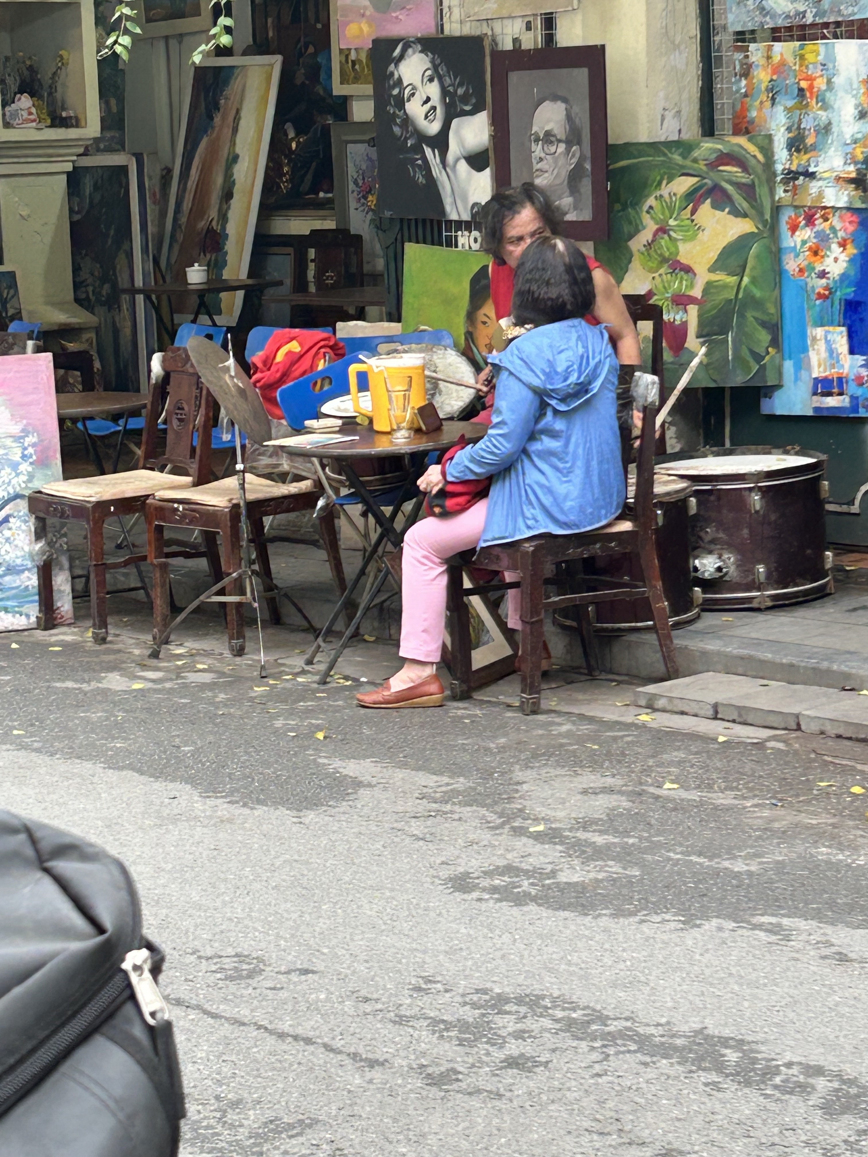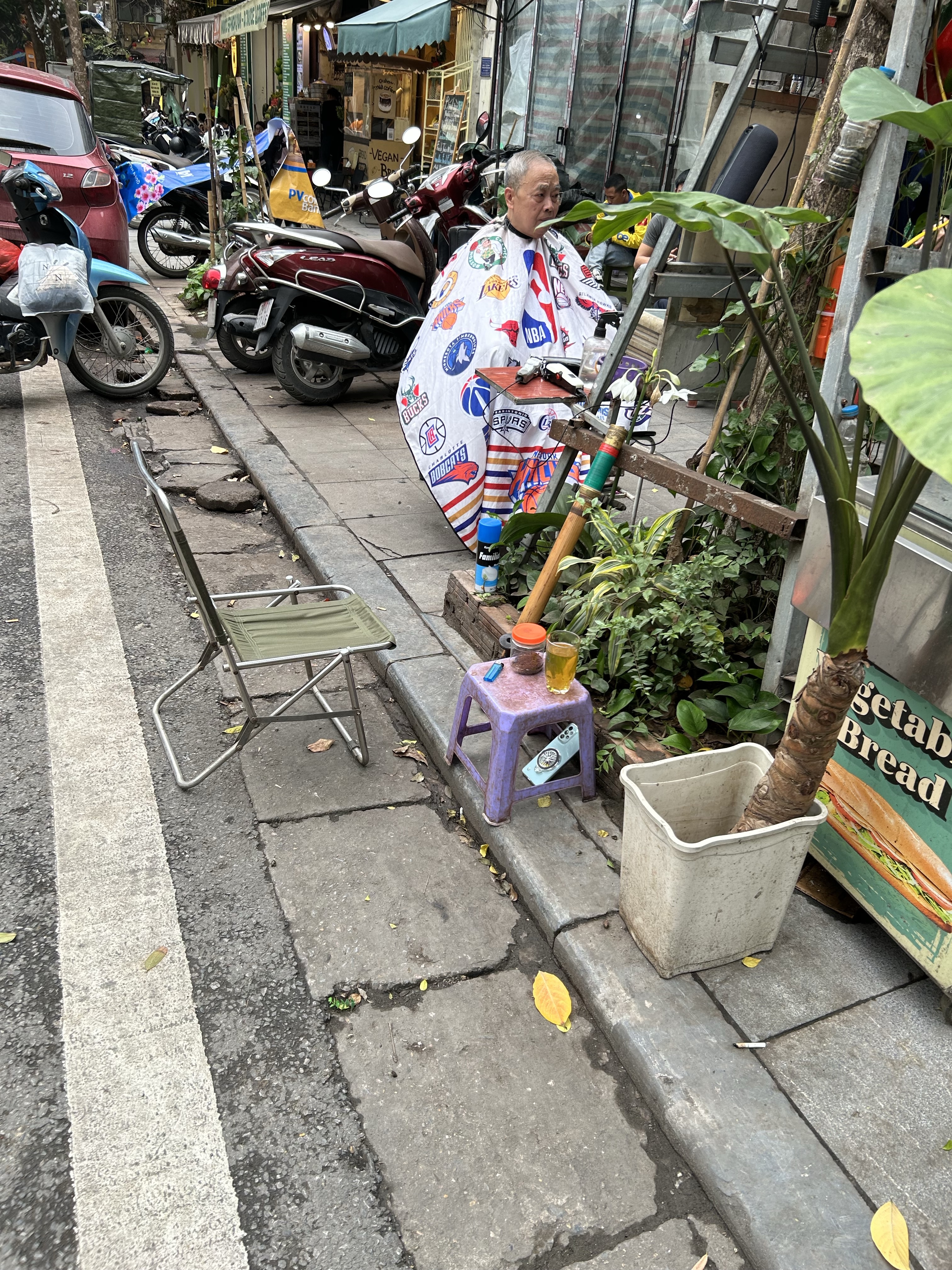 But, again, I digress. The point of this post was that we had an afternoon and evening in Hanoi that we had not really focussed on before it happened. So we walked and watched and soaked up the street life. We came across two very different haircuts happening on the street – our guide had told us earlier that if you want good, you go to a barbershop or salon, but if you want cheap you go to a street service – only about CAD$6 but if the police show up at the end of the block both you and the barber have to leg it. We saw guys drinking beer and smoking (tobacco, I think) in their huge bamboo bong, we saw a man with a snare drum accompanying a woman with a microphone in a small street singing random karaoke, we saw men playing some sort of gambling board game on the sidewalk and, best off all, while having maybe the best cup of flower/herbal/ginger tea imaginable in the Old Quarter, we saw not only a new refrigerator being delivered on the back of a small motorcycle but also, moments later, the old refrigerator being strapped across the back of an aged bicycle and ridden away into the afternoon traffic. It was a full afternoon. Hasta la vista, Hanoi.