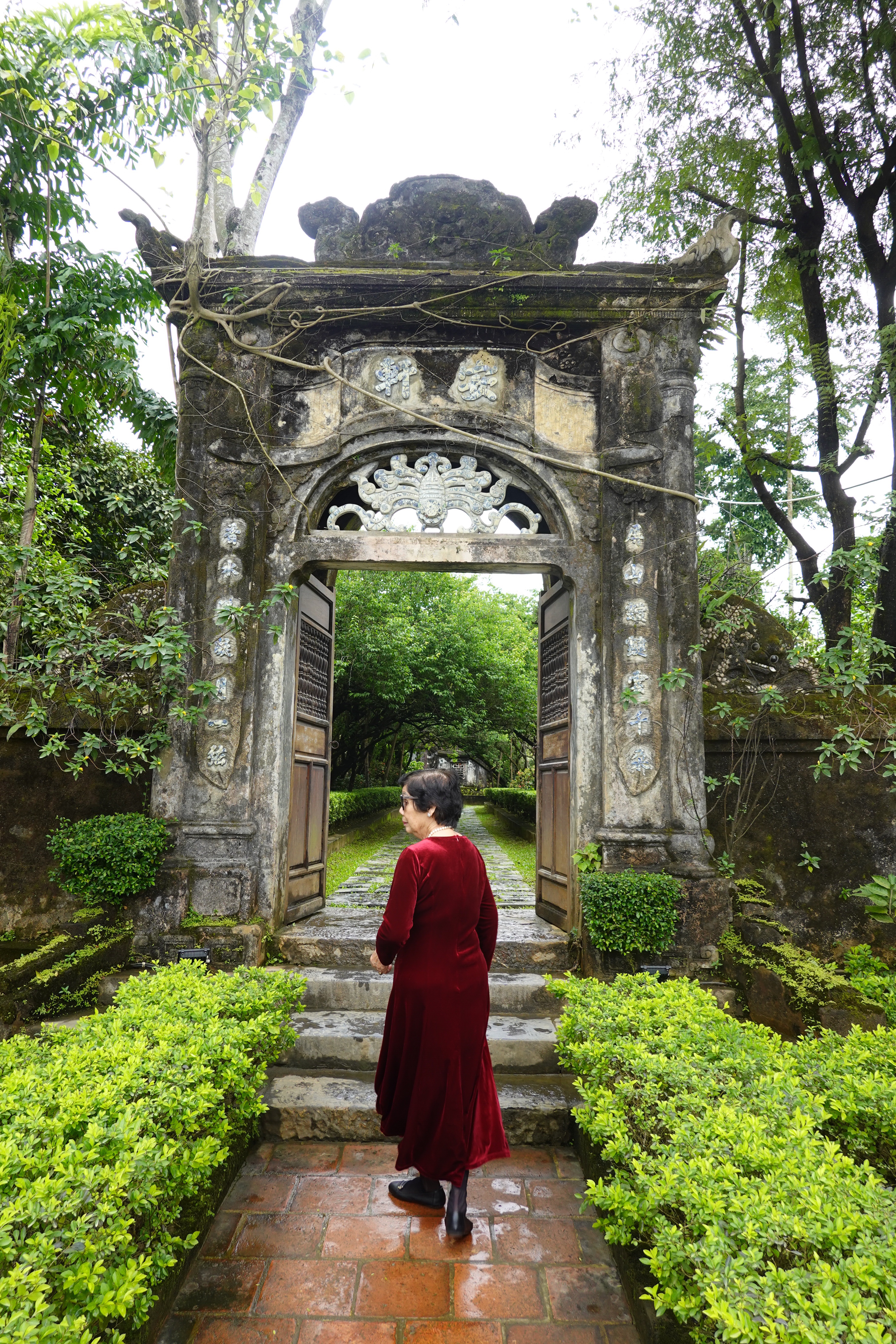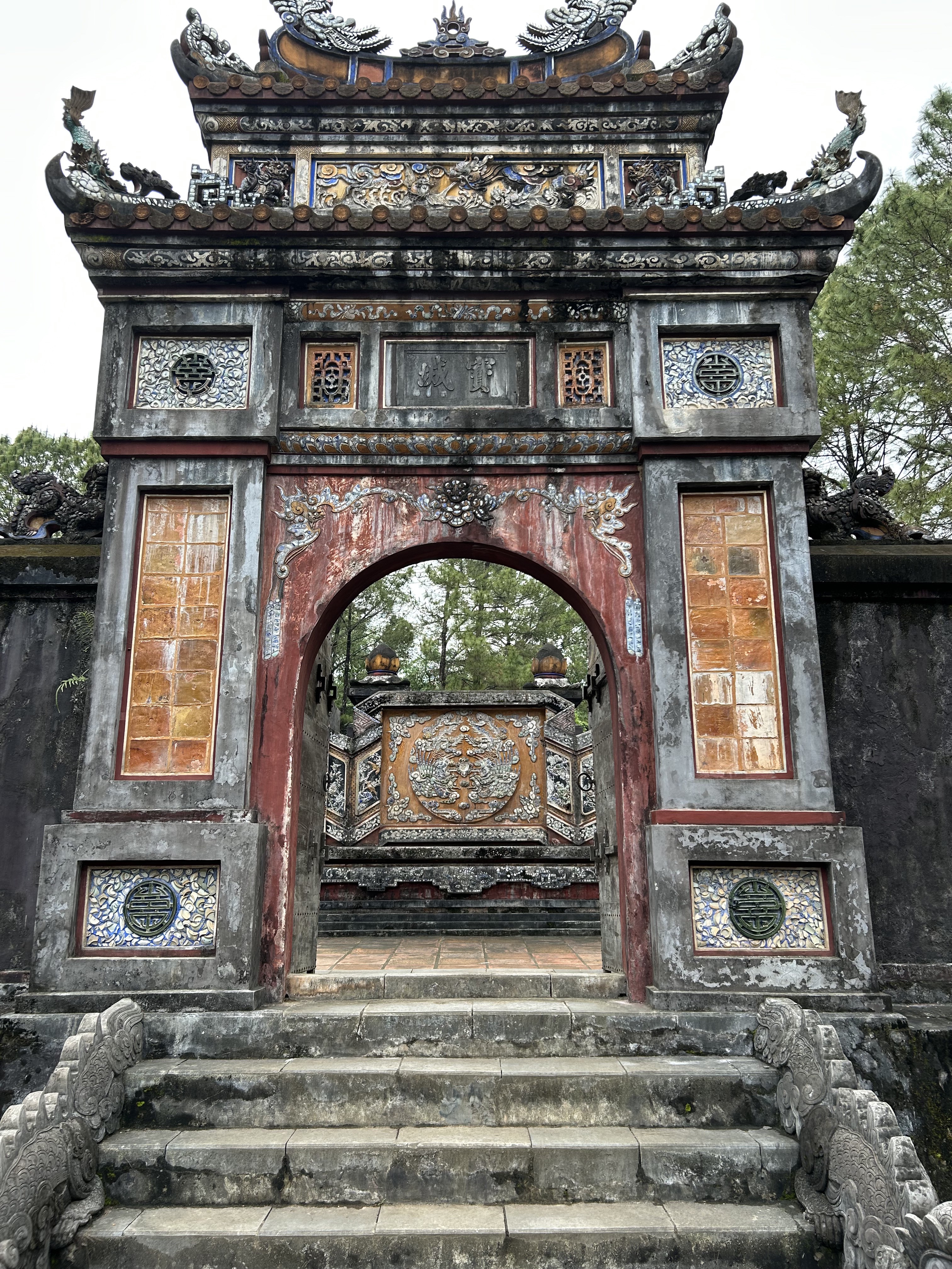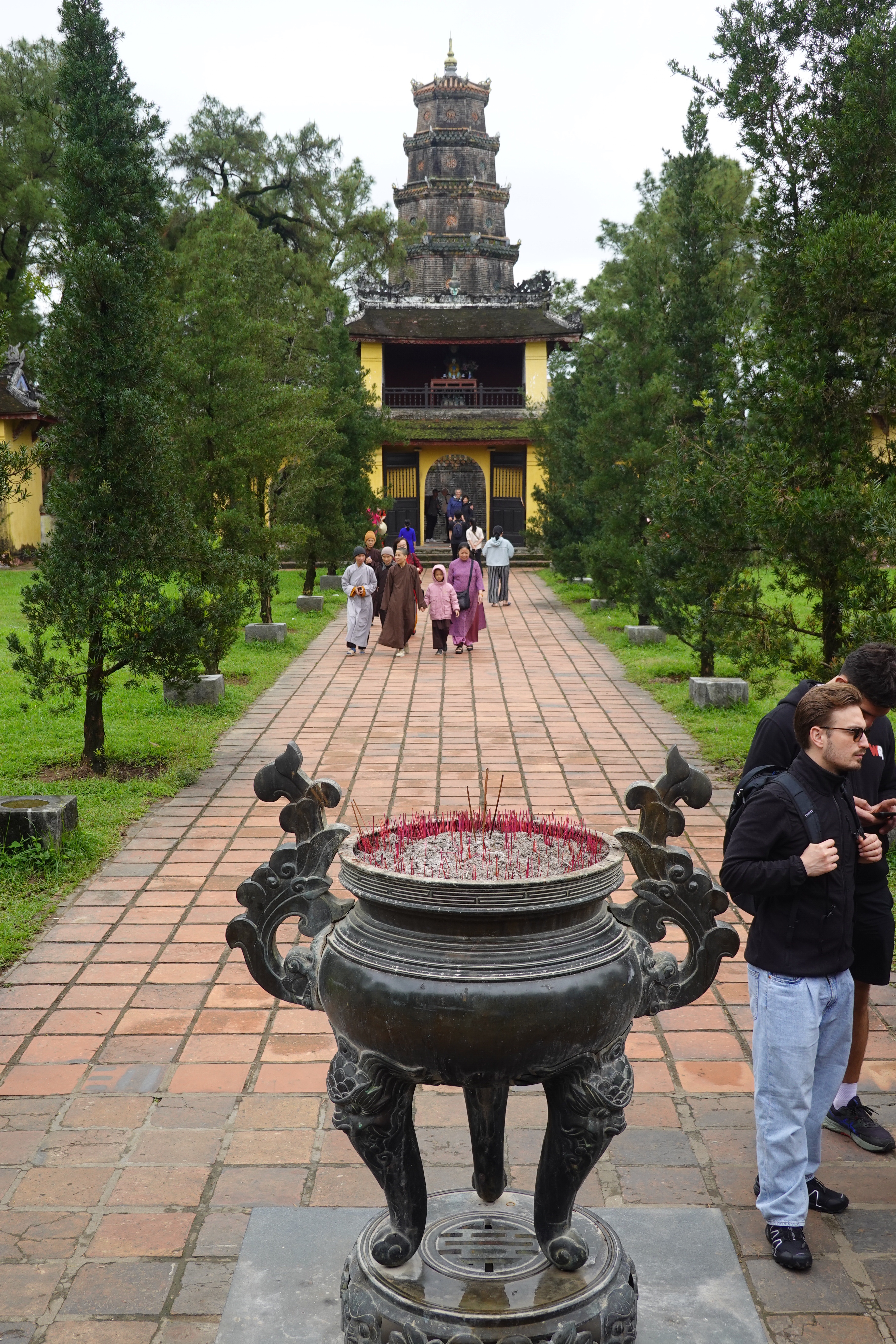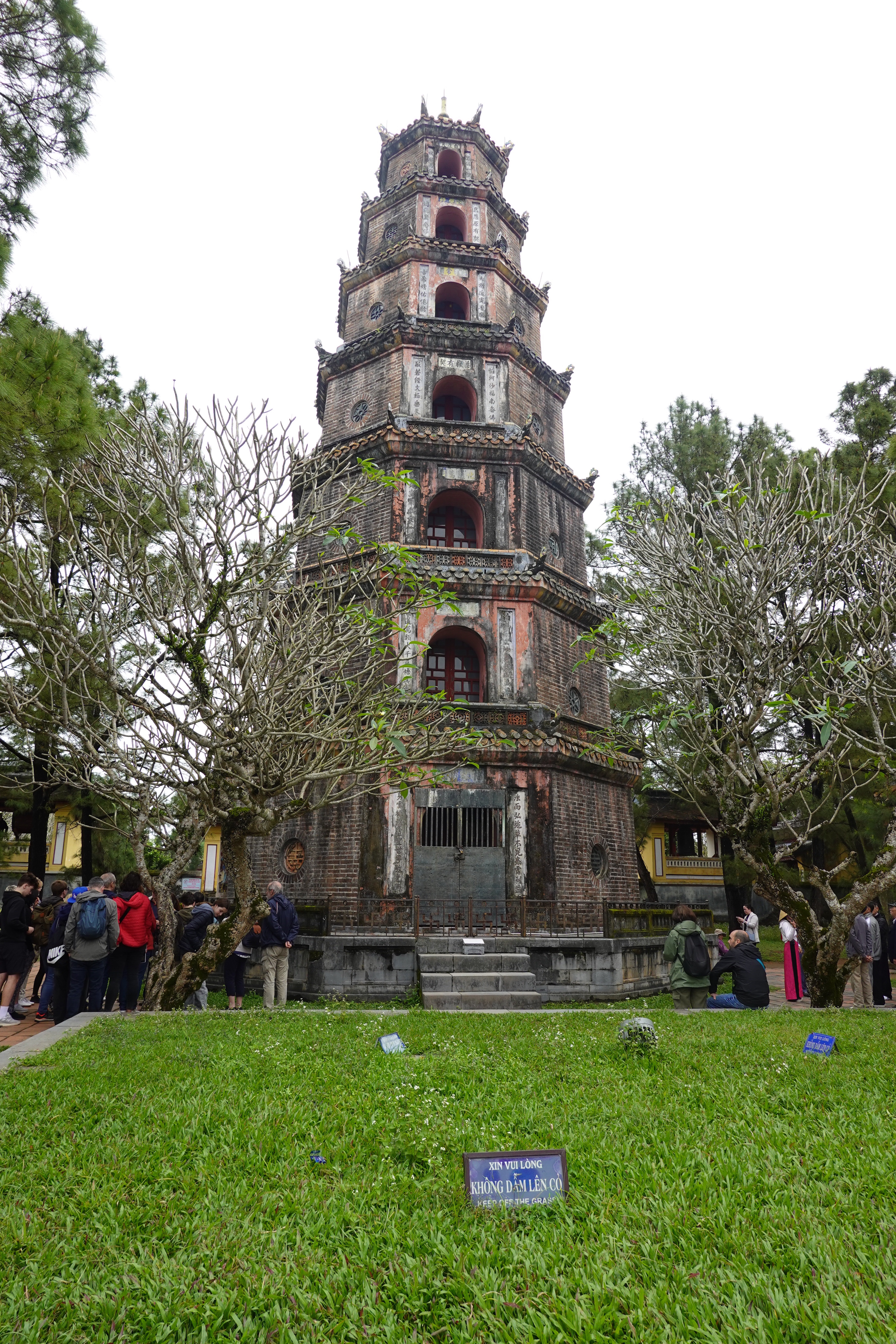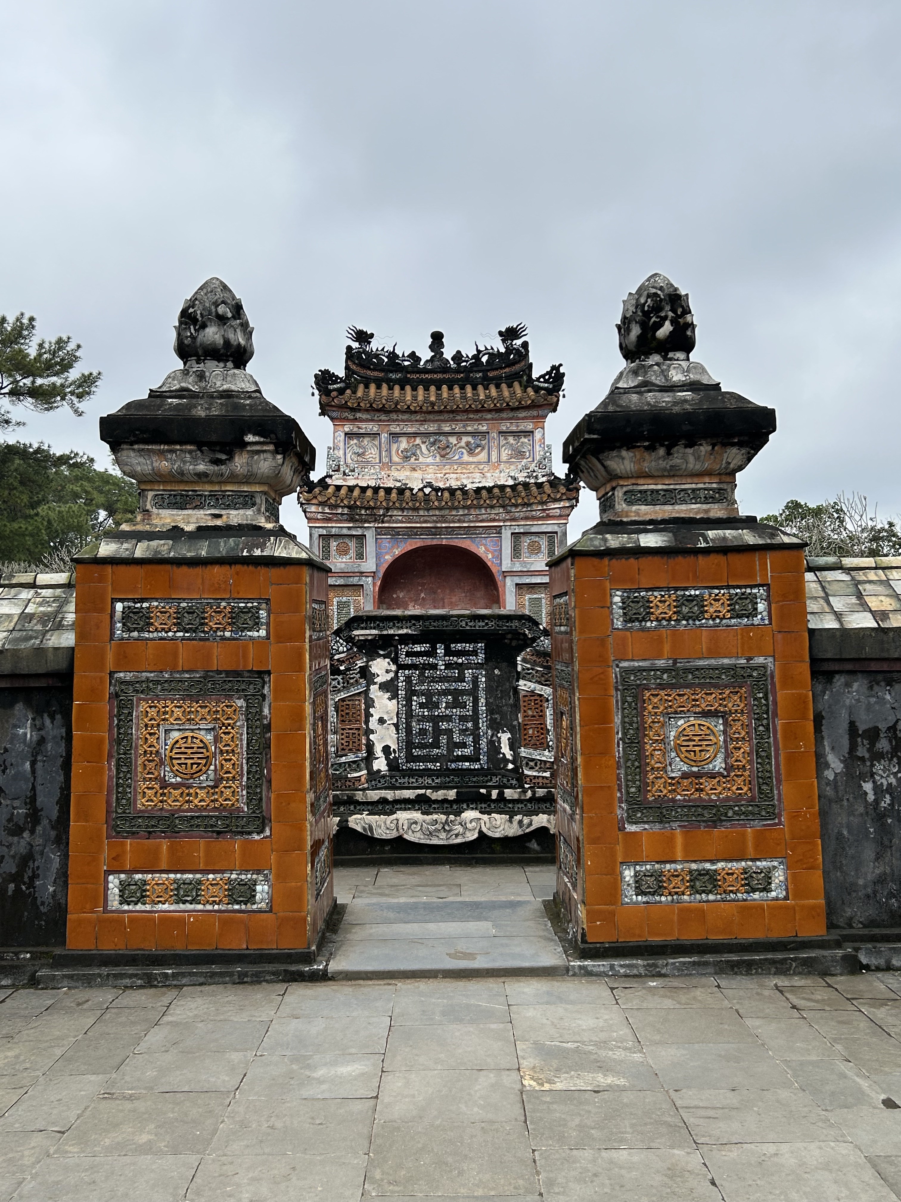 AnyHué. These kings managed to create some very cool things in between taxing the population, mingling with the 100 or so concubines that each kept on the side to go with their several wives, and doing whatever the French told them to do. We visited a beautiful airy house built for a princess, with a feng shui inspired pond in front, which the princess sold to a mandarin only a year later. We spent a lot of time in the Imperial City, a large walled and moated imperial space set inside a much larger walled and moated precinct with 10 kilometres of perimeter walls, with the larger precinct full of houses and streets and stores but with the smaller space preserved for what remains of the kings’ residence and offices and ceremonial buildings after American bombs blew most of it up in 1968. And we went to the outskirts of Hué to see an early king’s summer palace and to see his tomb and those of his wife and one of who his adoptive sons who lasted only 7 months on the throne and so did not have time enough to build himself a tomb on his own property. And in between all that we went to a very old pagoda with a 7 storey tower (we have been schooled repeatedly on the fact that “pagoda” refers to the entire temple complex, and not to the tower, which is referred to as the tower) and with a small number of monks still in residence.